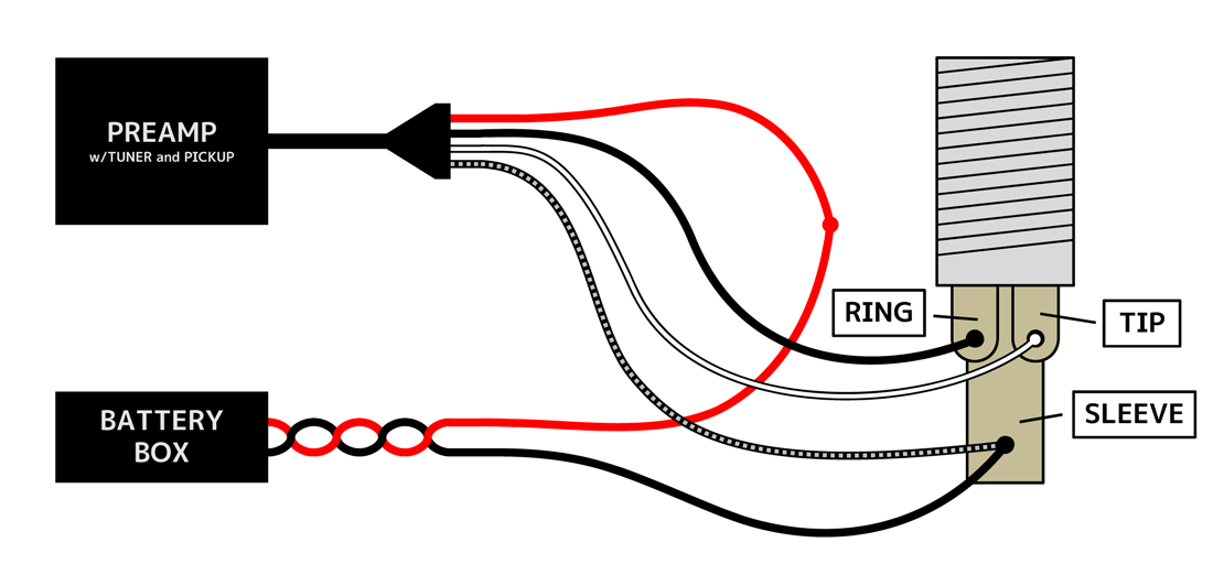 バッテリとプリアンプのグラウンドが両方ともジャックのスリーブにつながっているのがめずらしいけれど、シールドを挿さない状態(リングとスリーブがショートしない状態)でもチューナ機能を使えるようにするためかな、たぶん。