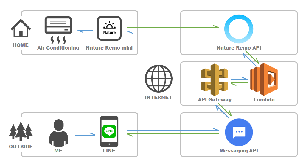 LINE@(と Messaging API)と AWS の Lambda(と API Gateway)、Nature Remo の API でできています。Lambda のランタイムは Node.js です。