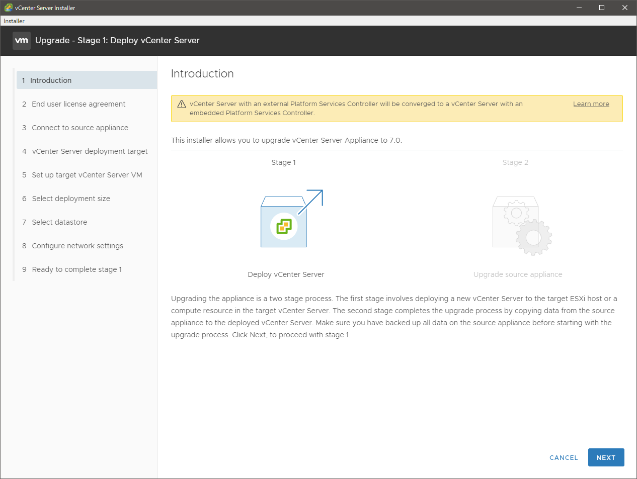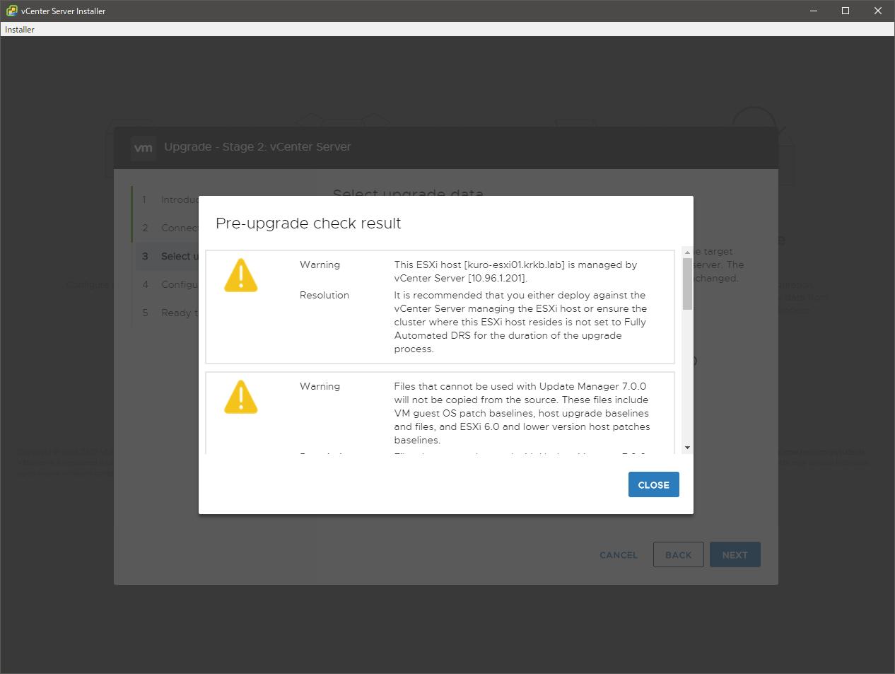OEM のドライバを使っている場合はどうしろとか、現行バージョンが vCSA の 6.7 U2c か U3 なら事前にコレをやれとか、いろいろ書いてあるので、該当する場合はその通りにするとして、凝ったことををしていない今回のようなシンプルな構成であれば、実際の作業はウィザードをぽちぽちするレベルで終わりです。