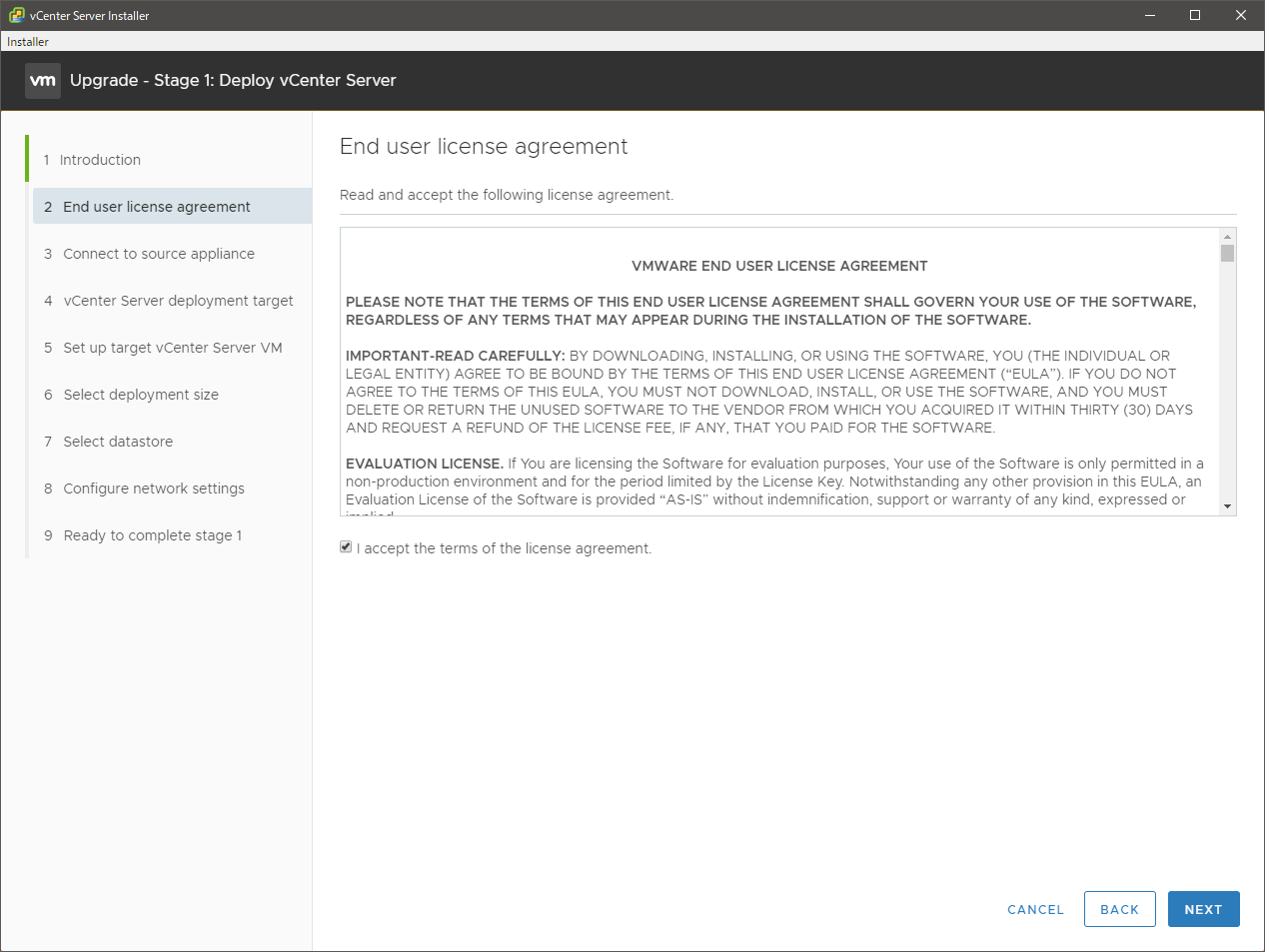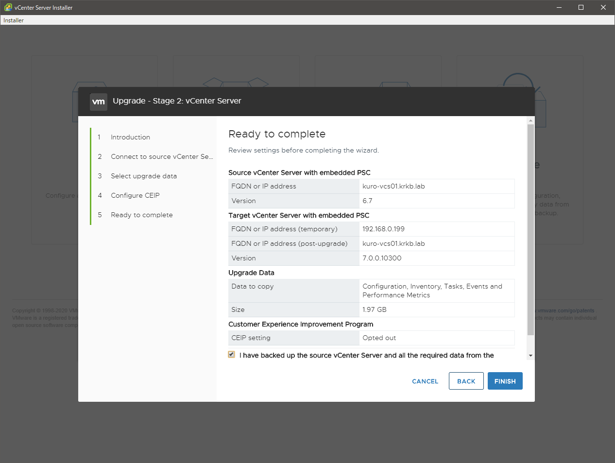 現行 vCSA のバックアップを取得済みであることを宣言して続行します。バックアップ、実は取っていませんでしたが、失敗してもまあヨシな環境なのでそのまま進めました。