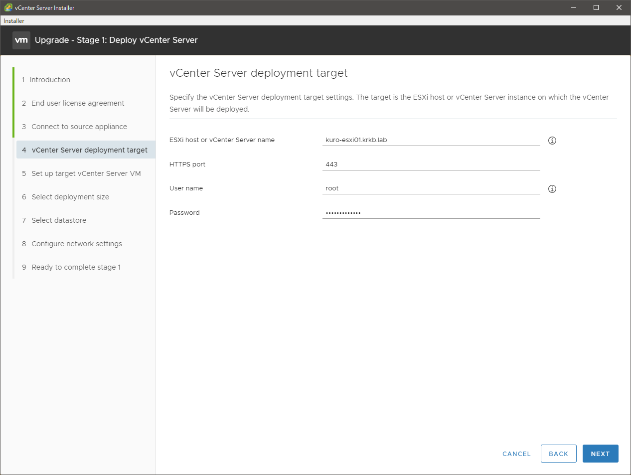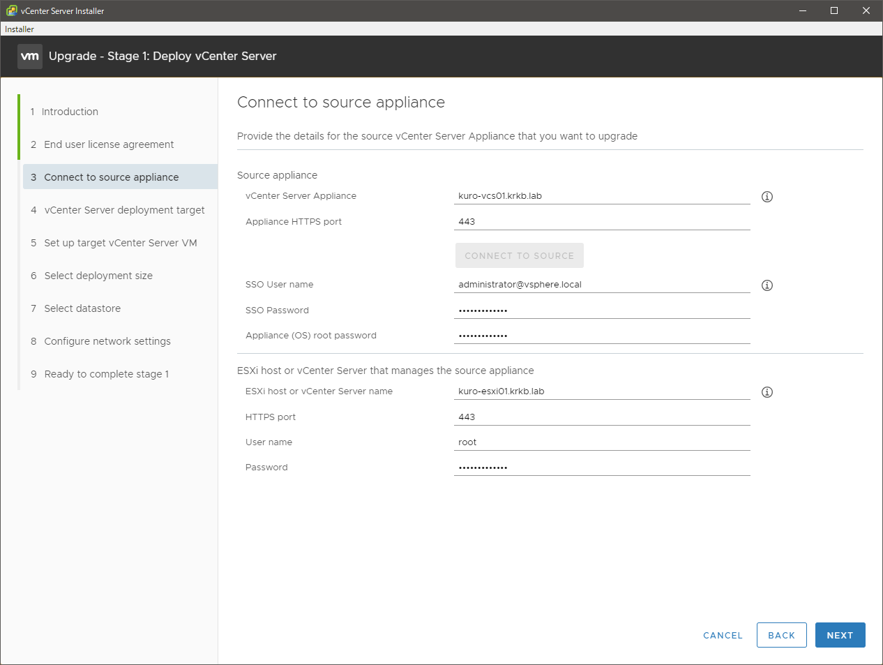現行の vCSA の情報を入力して、接続を確認します。認証情報と、現行の vCSA それ自体が動作している ESXi の情報も入力します。