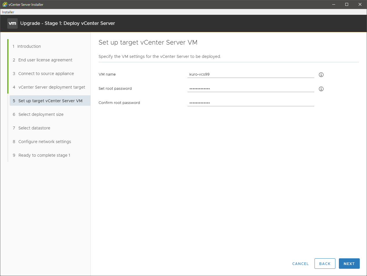 新しい vCSA の仮想マシン名とパスワードを指定します。新しい vCSA が現行の vCSA と同じインベントリに並ぶことになる場合は、現行の vCSA と同じ仮想マシン名だとこの段階で怒られるので、別の名前を入れます。