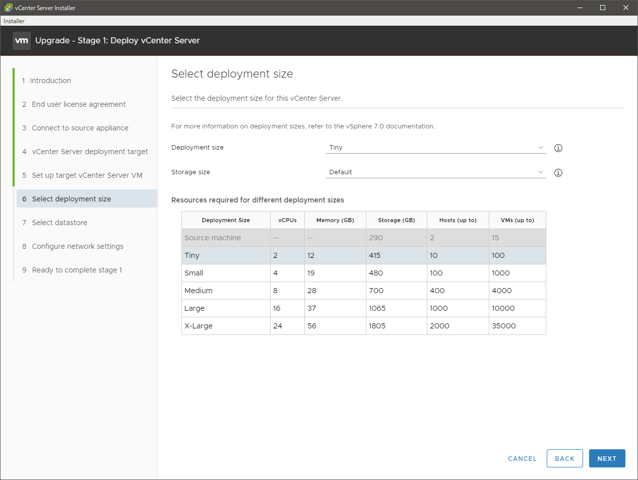 新しい vCSA のサイズを指定します。