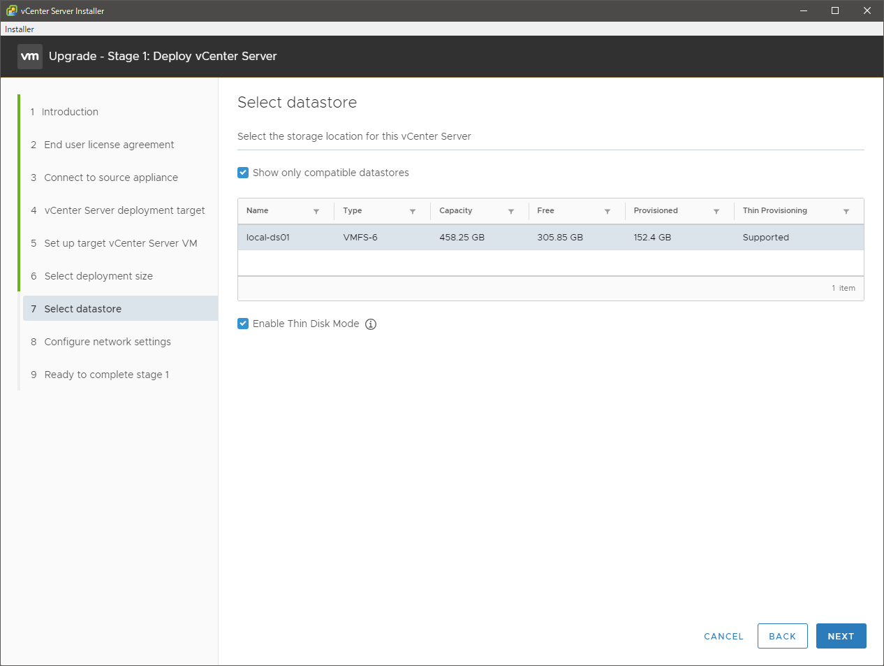新しい vCSA を配置するデータストアを指定します。シンプロビジョニングにしたい場合はチェックも入れます。