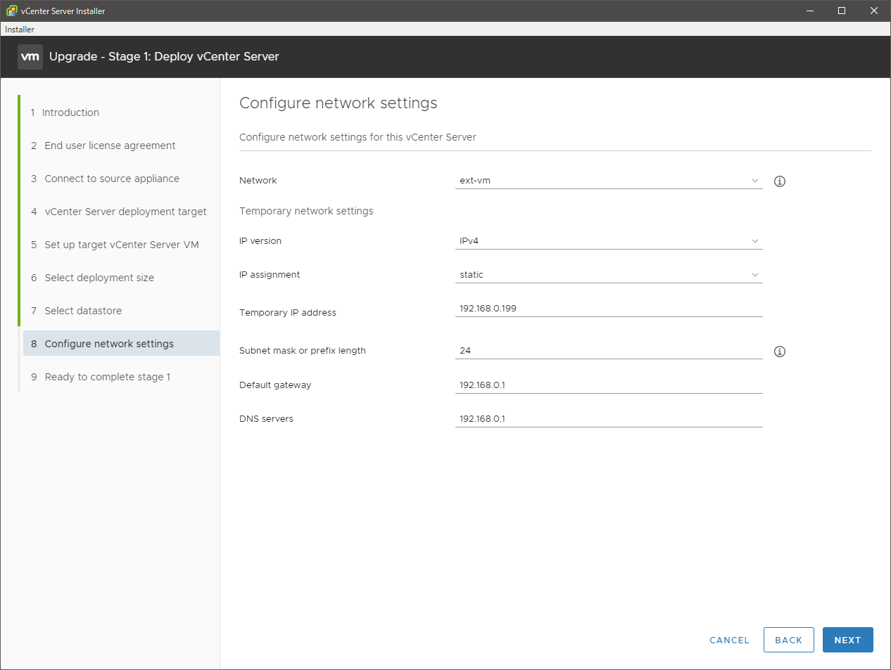 - 新しい vCSA インスタンスがデプロイされます。この段階では、IP アドレスは作業用の一時的なもの(作業時に指定)が付与されます