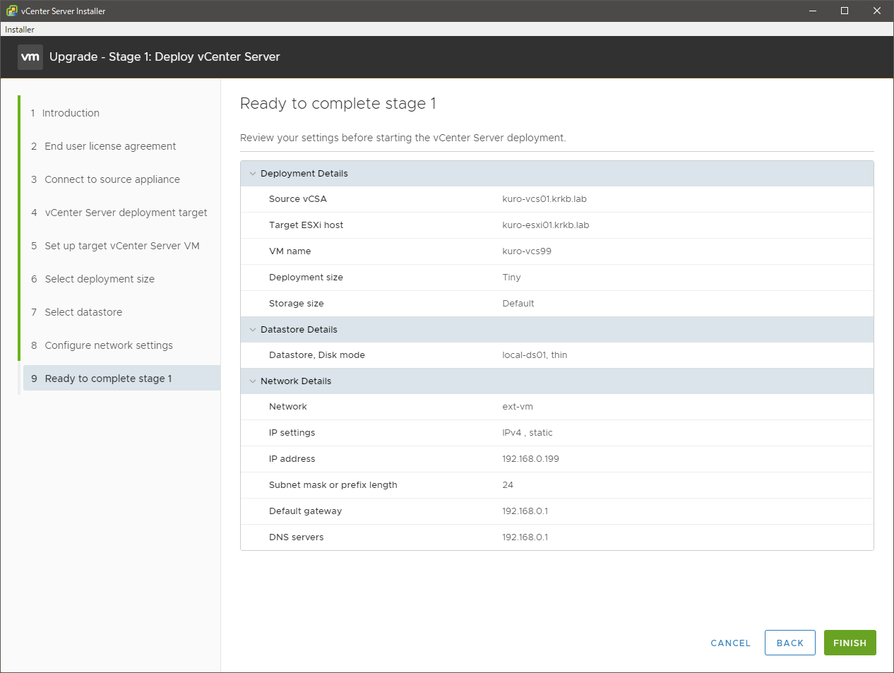 もちろん、現行が外部データベースを使っていたり、めちゃくちゃ古かったり、外部 PSC が居たり、そもそも Windows 版だったり、外部 VUM を立てていたりすると、いろいろ考慮事項も当然でてくるので、その辺りはドキュメントを読んでください。