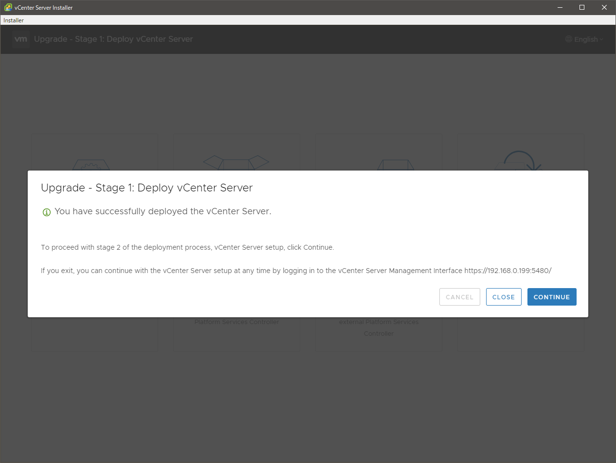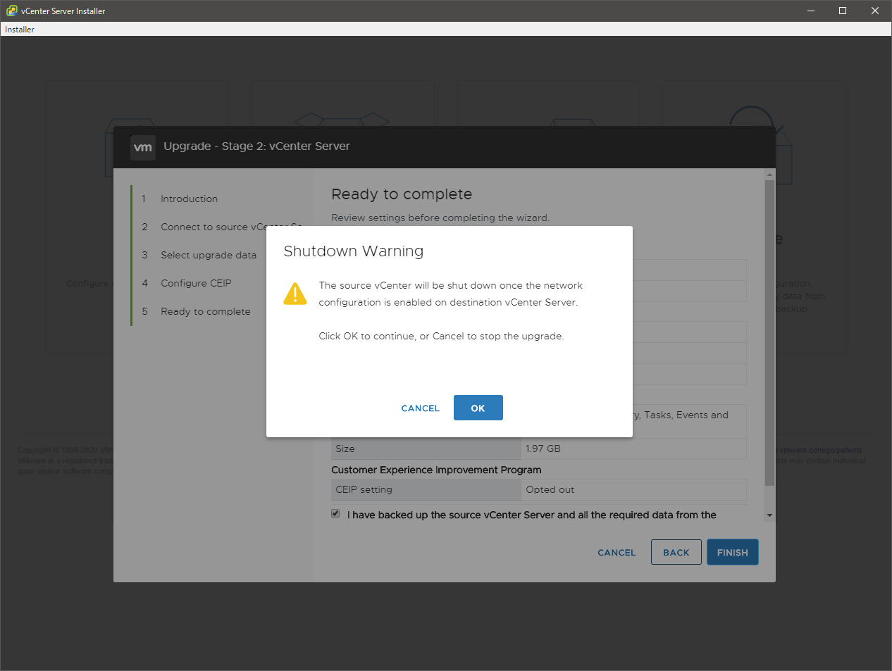 最後の最後に、現行 vCSA が停止する旨の確認がでて、了承すると実際の処理が開始します。