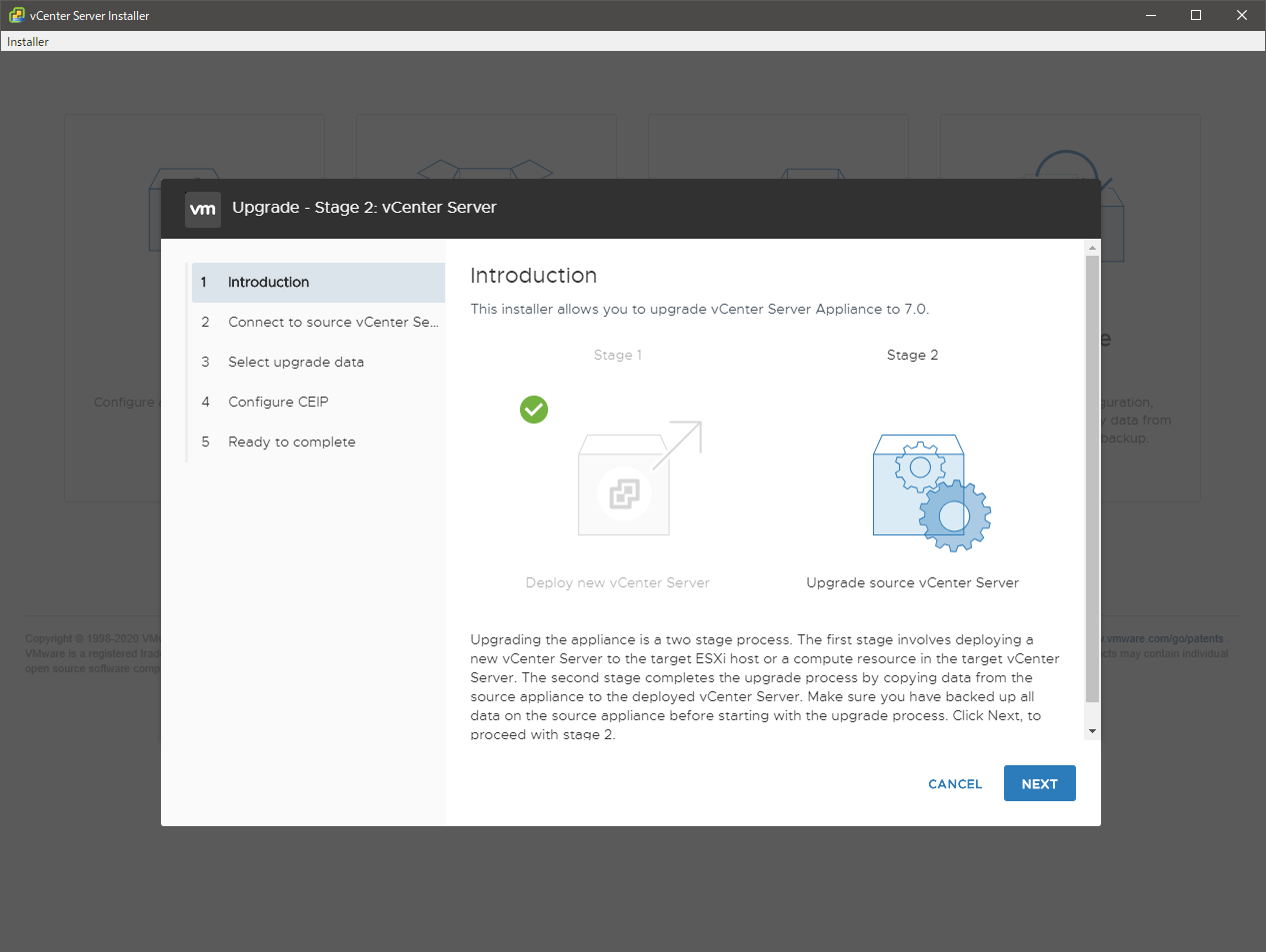 ここから Stage 2 です。[NEXT] で進むと、アップグレードの事前チェックが開始されます。