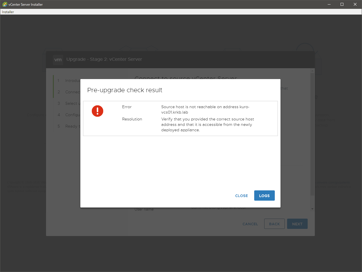アップグレード前、つまり 6.7 の構築時点で手抜きをしていたので、今回の環境内には DNS サーバがありません。このため、アップグレードの Stage 2 の冒頭の事前チェックで、新しい vCSA から現行の vCSA のホスト名が解決できずにエラーになりました。