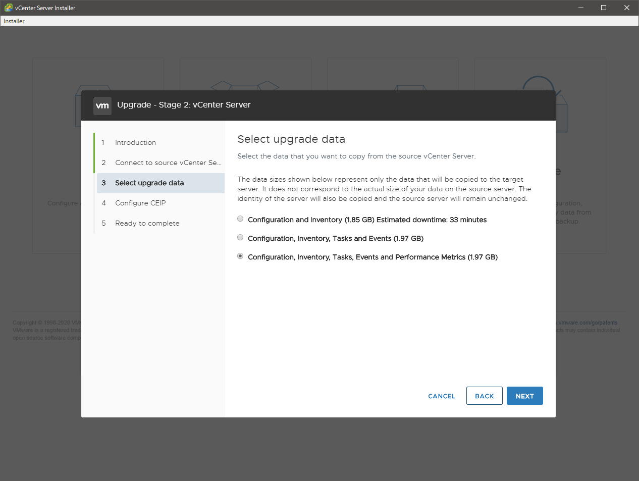 アップグレードするデータの種類を選びます。構成情報だけでなく、過去のタスクやイベント、パフォーマンスの統計情報なども移行できるようですが、その分データ量や作業時間は増えるようです。今回は、せっかくなので全部にしました。