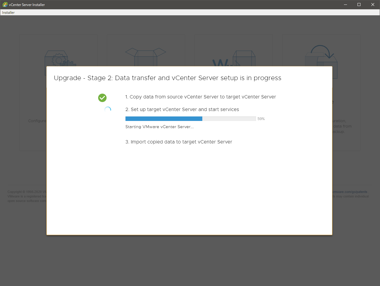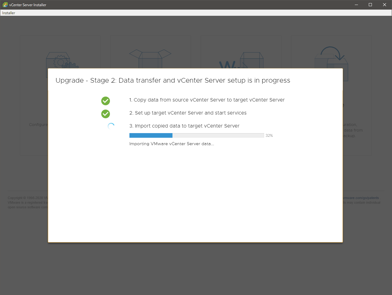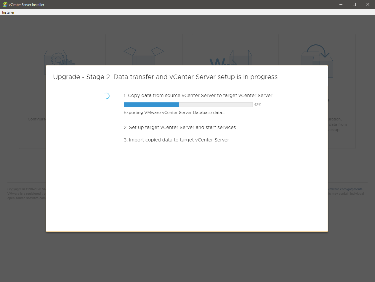 あとは待ちです。移行のデータは新旧の vCSA 間で直接やりとりされます。作業端末は経由しません。