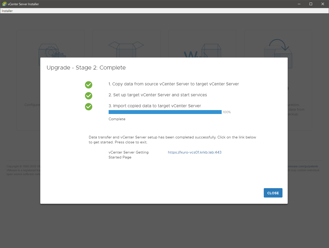 この後、状態を確認して、必要な後処理(これもドキュメントがありますが、典型的にはライセンスの投入など)を行えば、vCenter Server のアップグレードは完了です。