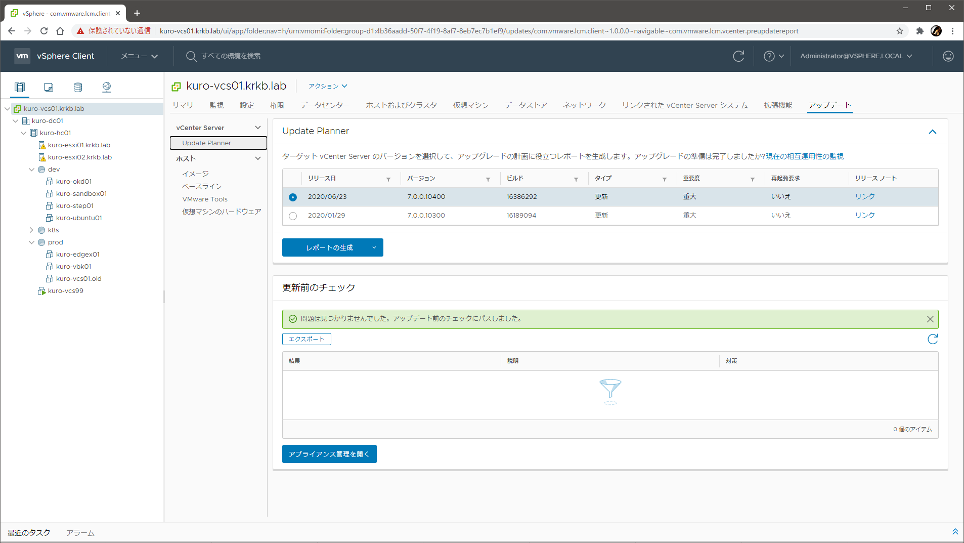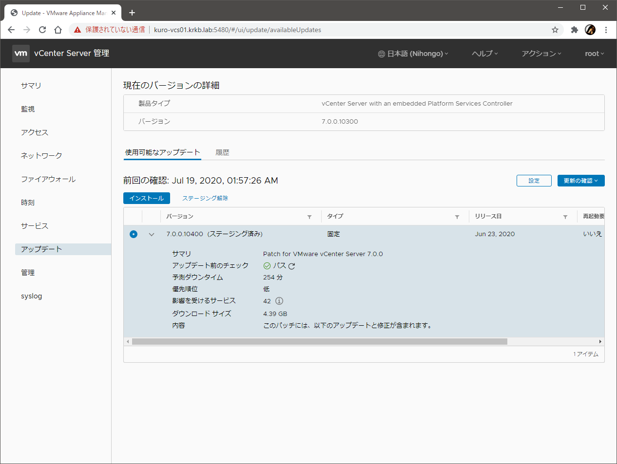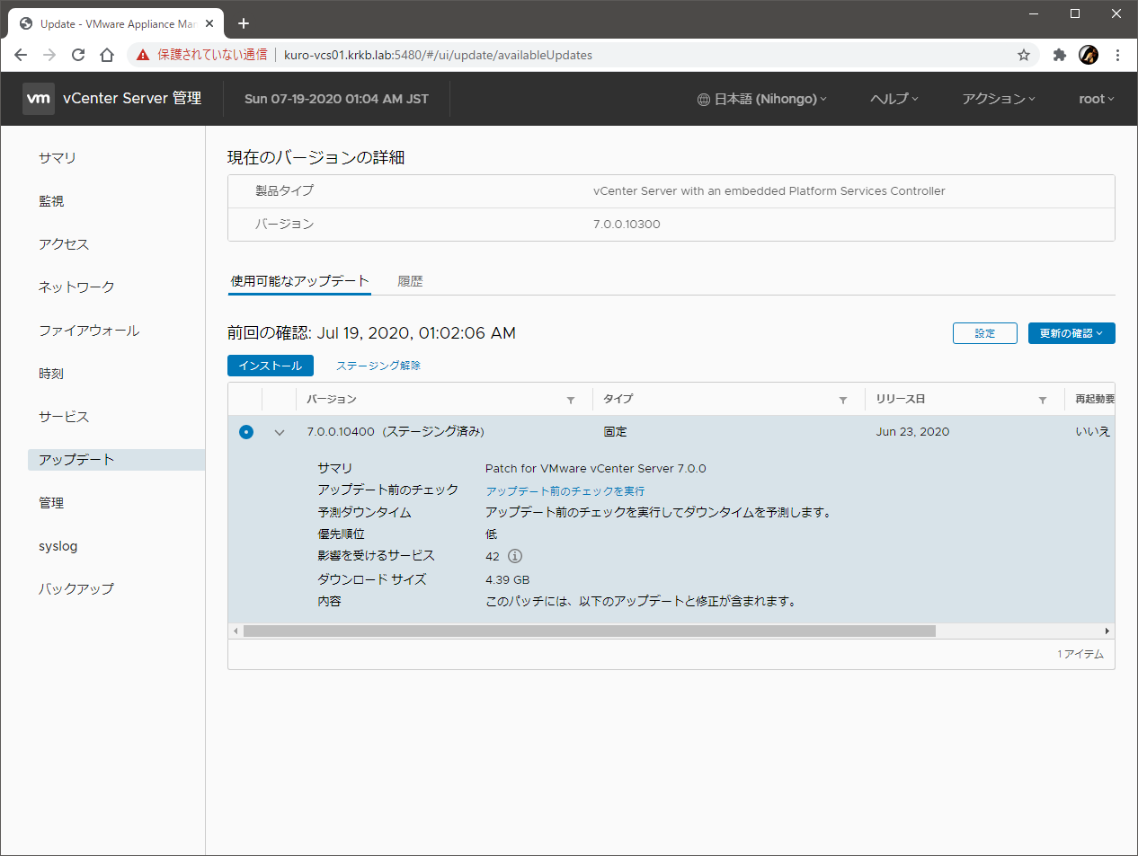 vSphere 6.7 環境のうち、vCenter Server を 7.0 にアップグレードし、パッチの適用も行いました。
