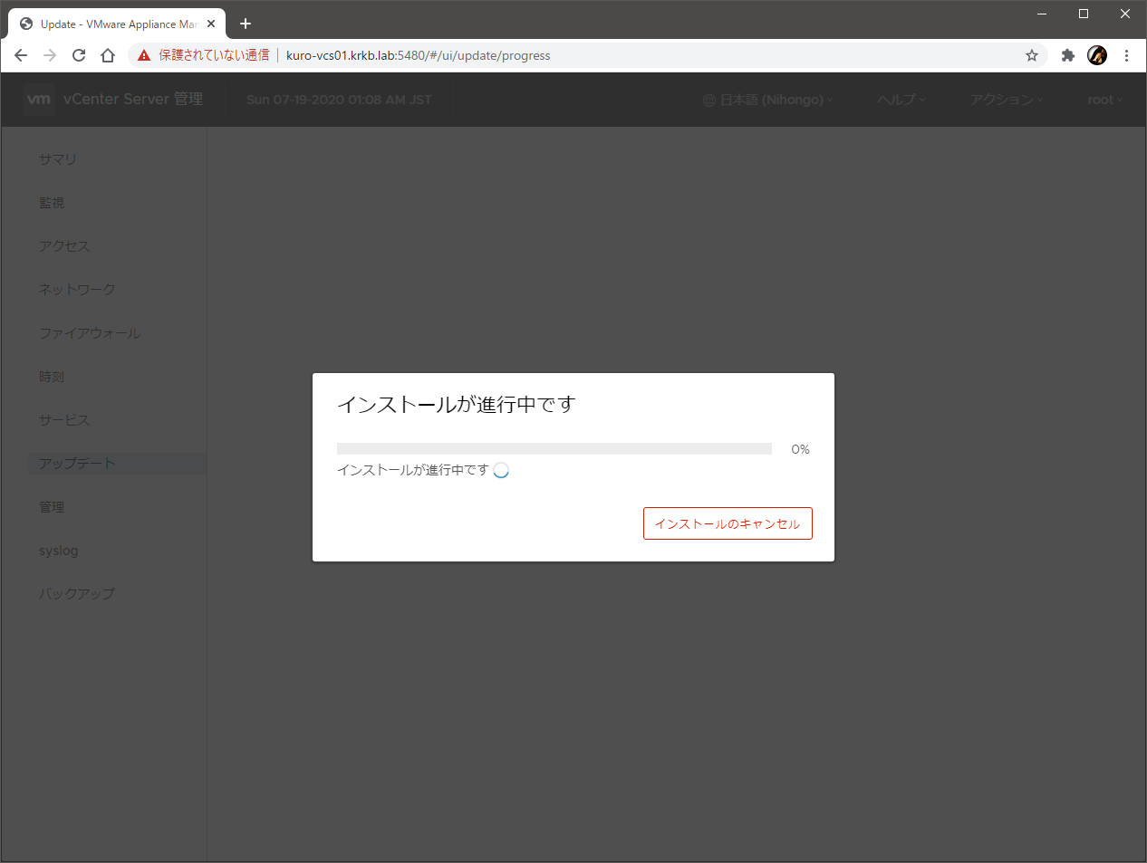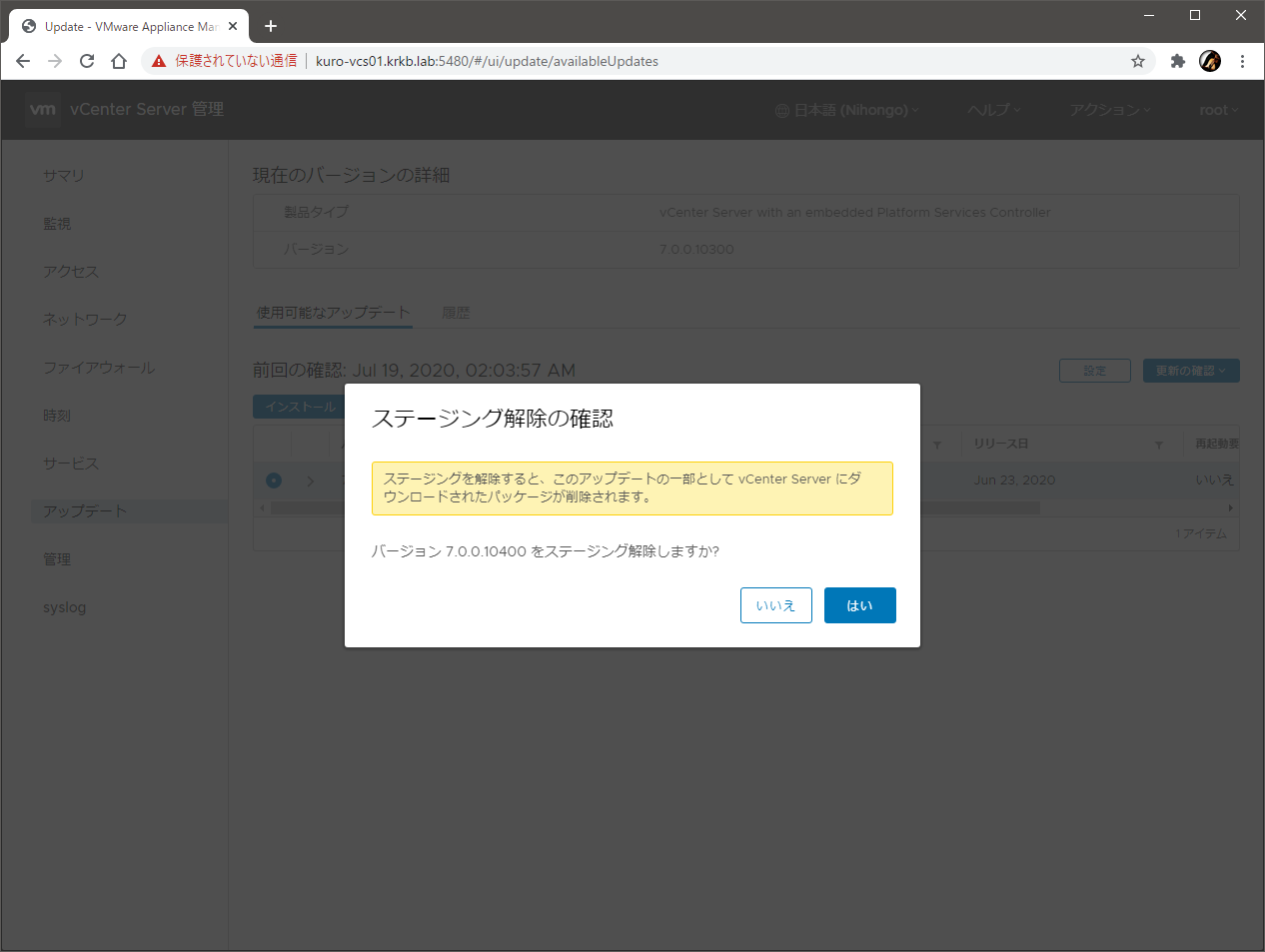 で、実際の適用は、VAMI から数クリックで行える…… はずなので、VAMI にログインして、最新のアップデートをいちどステージングして、その後インストールを開始したところ、