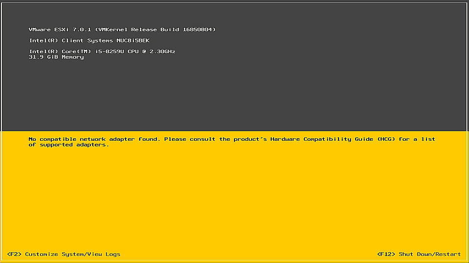 - NUC 8 では、ESXi 7.0 U1 から、組み込みのドライバではオンボード NIC を認識できなくなった