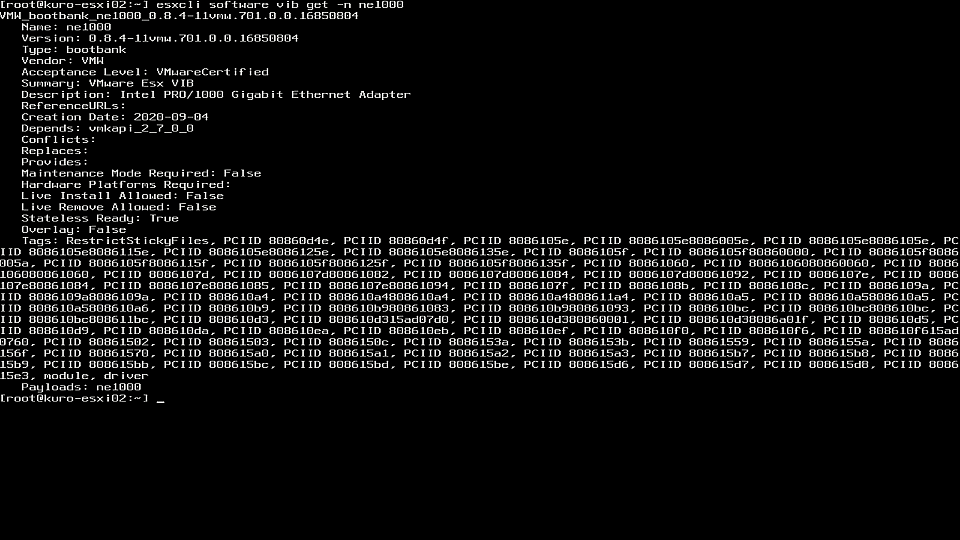 ここで、名前 フィールドを ne1000 でフィルタすると、7.0 U1 に組み込まれたバージョンである 0.8.4-11vmw.701.0.0.16850804 が選択されていることがわかります。