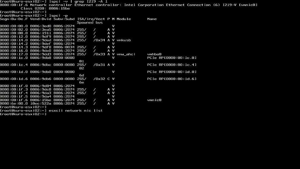 NUC8i5BEK に積んでいる NIC は Intel の Ethernet Connection (6) I219-V という(デバイス ID が 15BE の)ヤツで、これ自体は HCL にも 7.0 U1 でのサポートが載っています。対応するドライバは ne1000 で、死んでいる中を見ると入っているようにも見えますが、うまく使えていません。