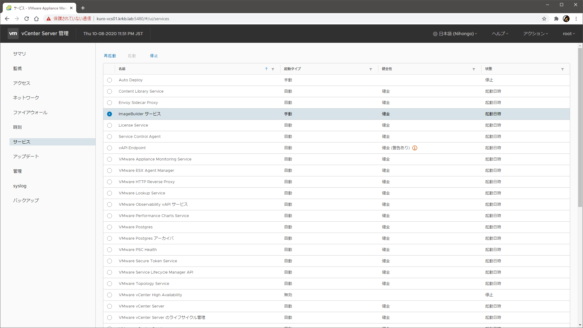 Image Builder はもう使わないので、VAMI から Image Builder サービス を選択して停止させます。起動させるときは Auto Deploy の 設定 タブからできましたが、停止はできないようで……。