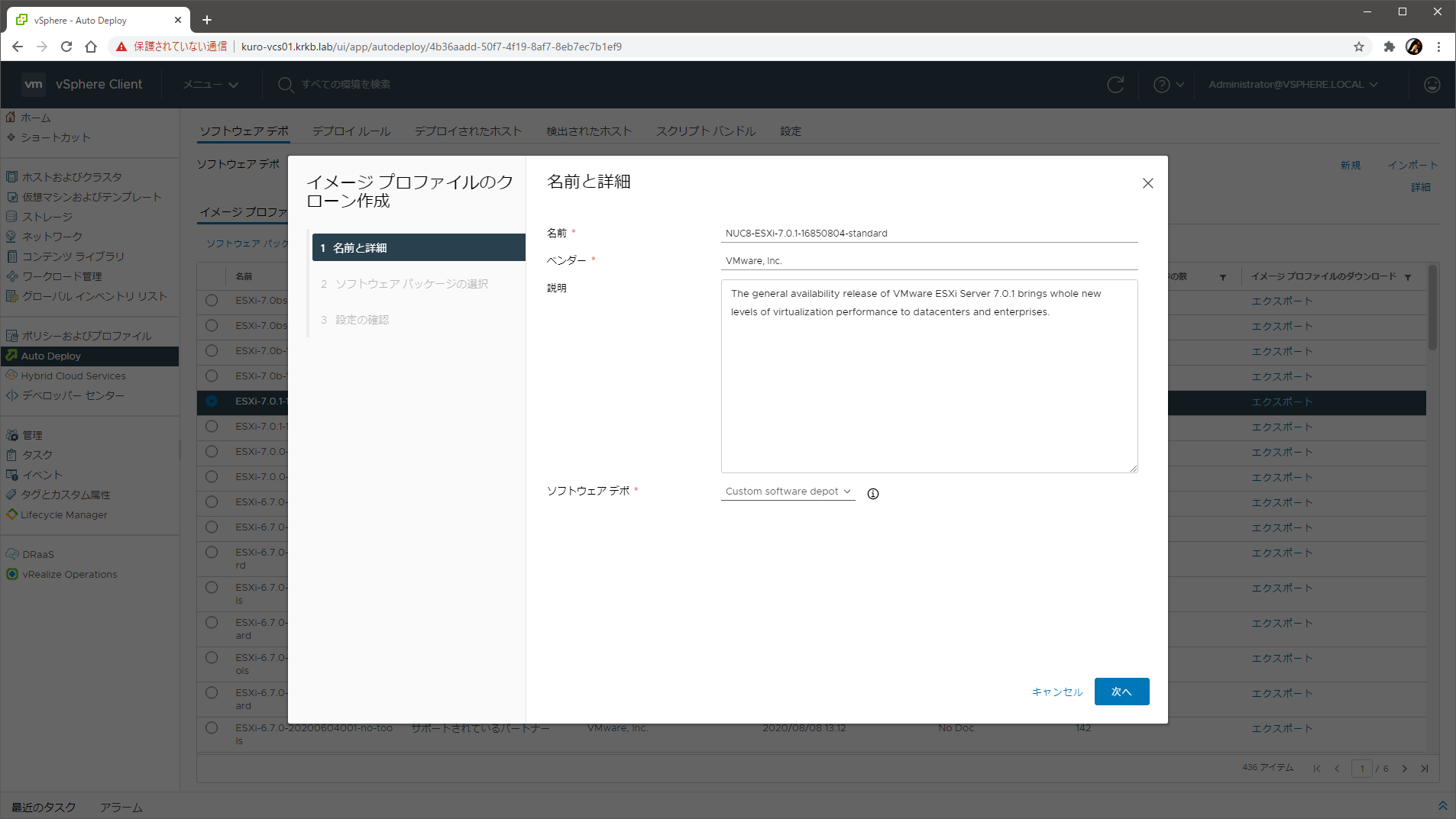 公式のオンラインデポの中から、ESXi 7.0 U1 のイメージ ESXi-7.0.1-16850804-standard を選択して クローン作成 し、名前を適当に変えて、複製先の ソフトウェアデポ として先ほど作成したカスタムソフトウェアデポを選択して進みます。