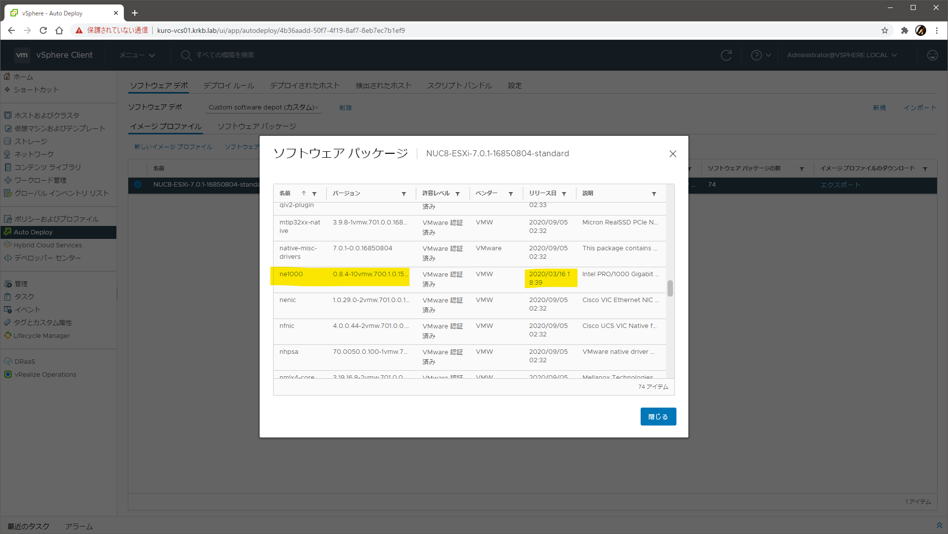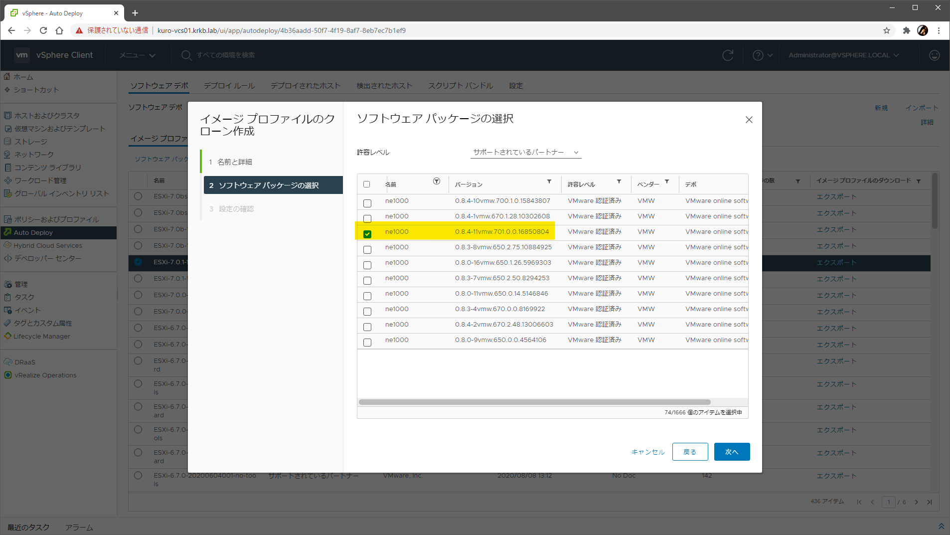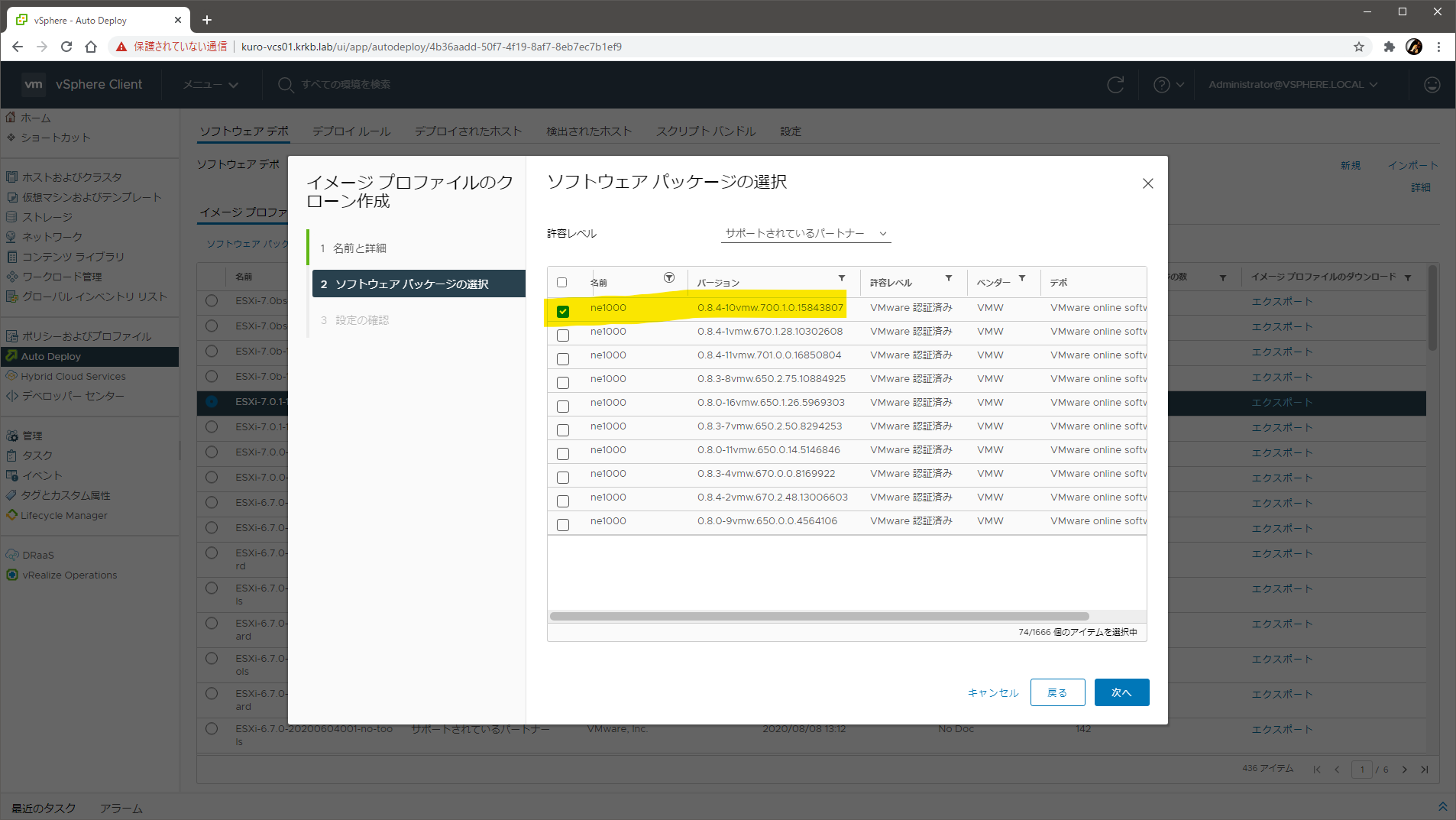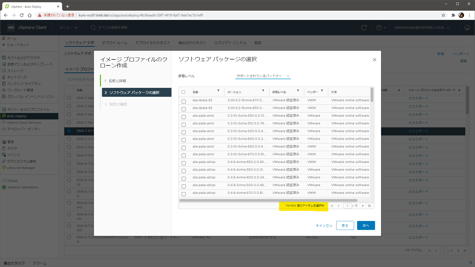 次の画面で、パッケージの一覧が表示されます。この一覧は、オンラインソフトウェアデポに含まれる全パッケージの全バージョン で、この段階で、ESXi 7.0 U1 のベースイメージを構成する 74 のパッケージが選択済み になっています。