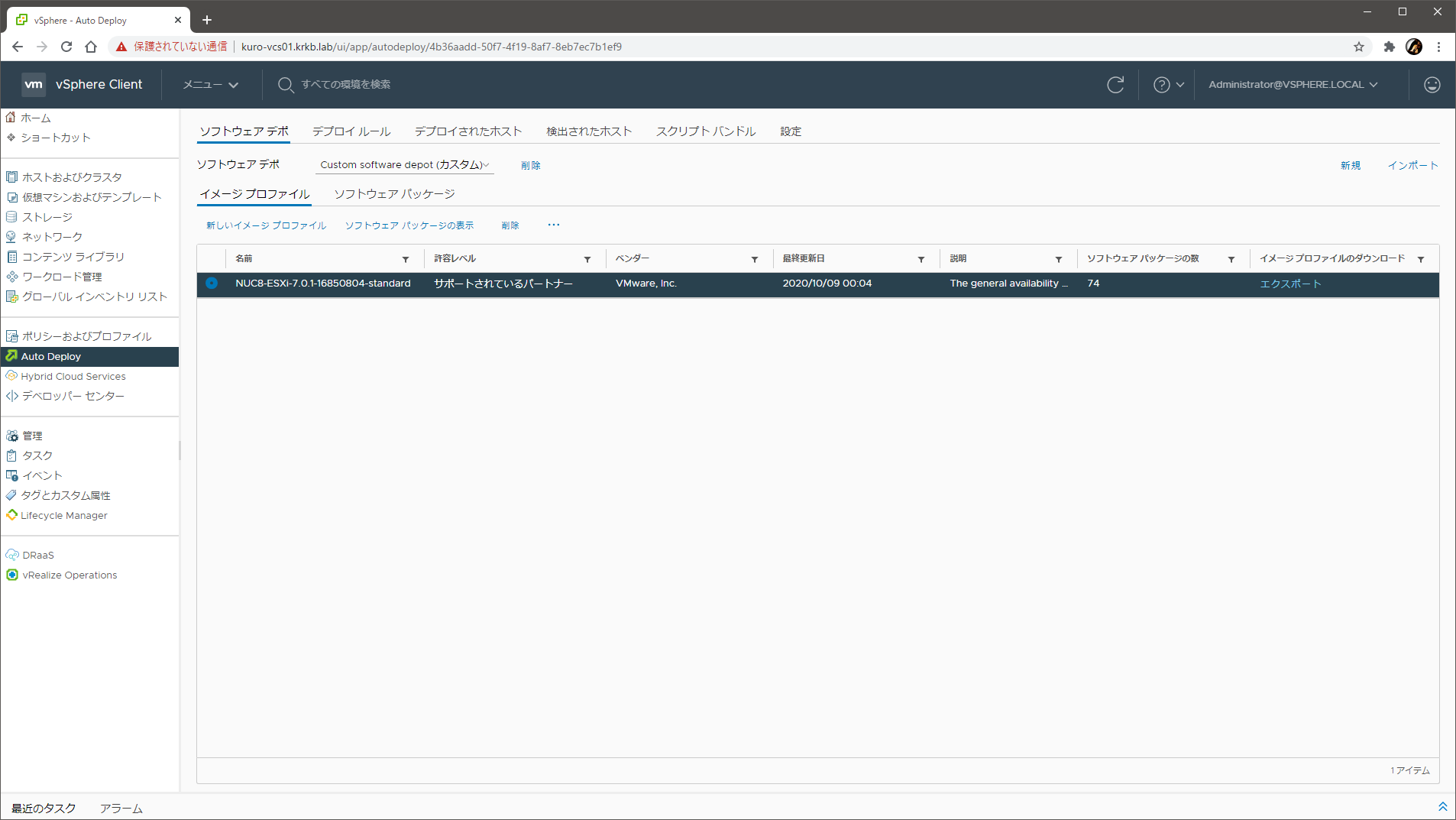 その後、画面を進めて 完了 すると、カスタムソフトウェアデポに、カスタマイズ済みのイメージプロファイルができあがっているはずです。