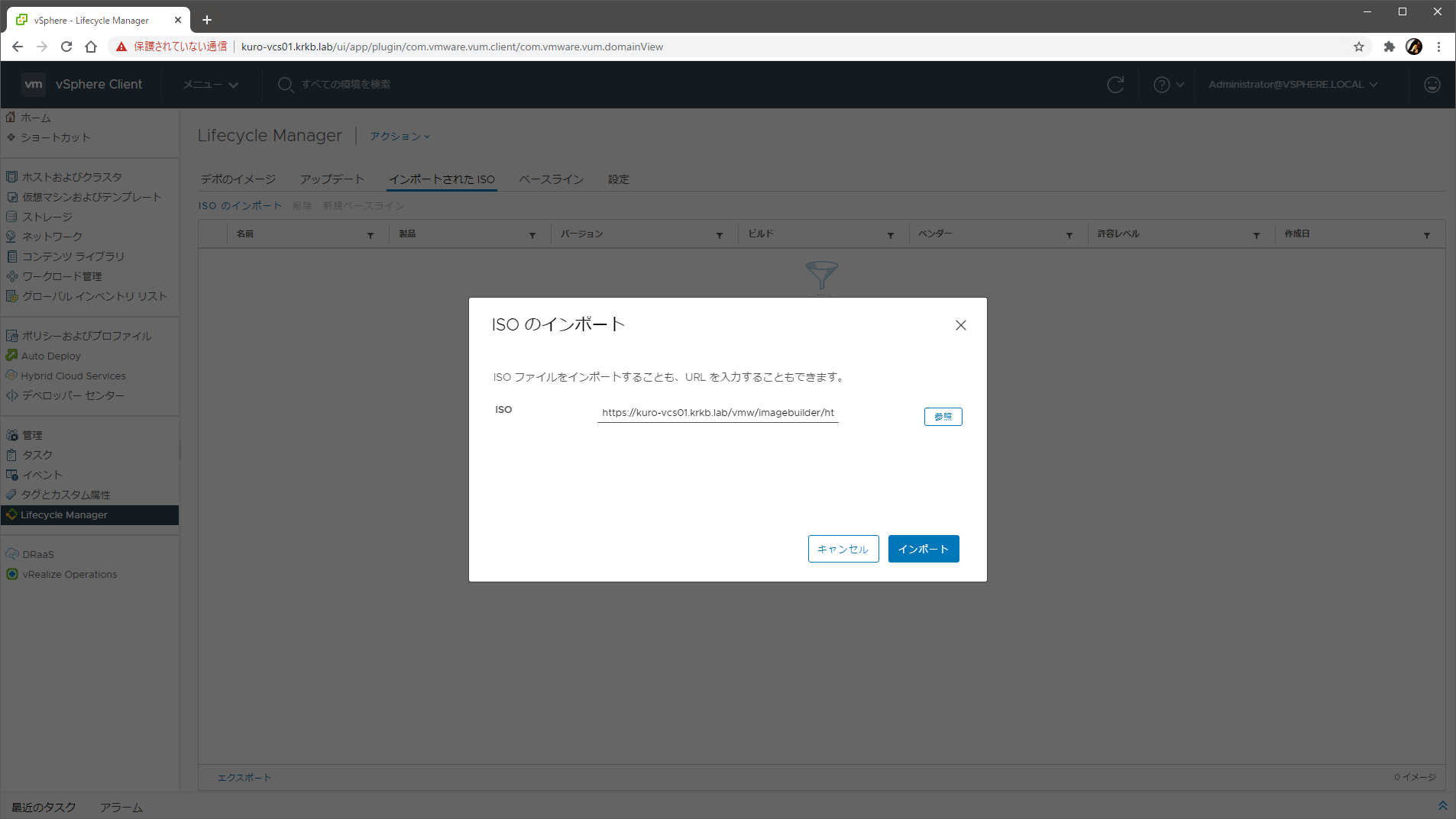 ISO がダウンロードできた(か、URL がコピーできた)ら、vLCM の画面に移動して、インポートされた ISO タブの ISO のインポート から、先ほど作成された ISO ファイルをアップロード(か、コピーしておいた URL を指定)し、インポートさせます。