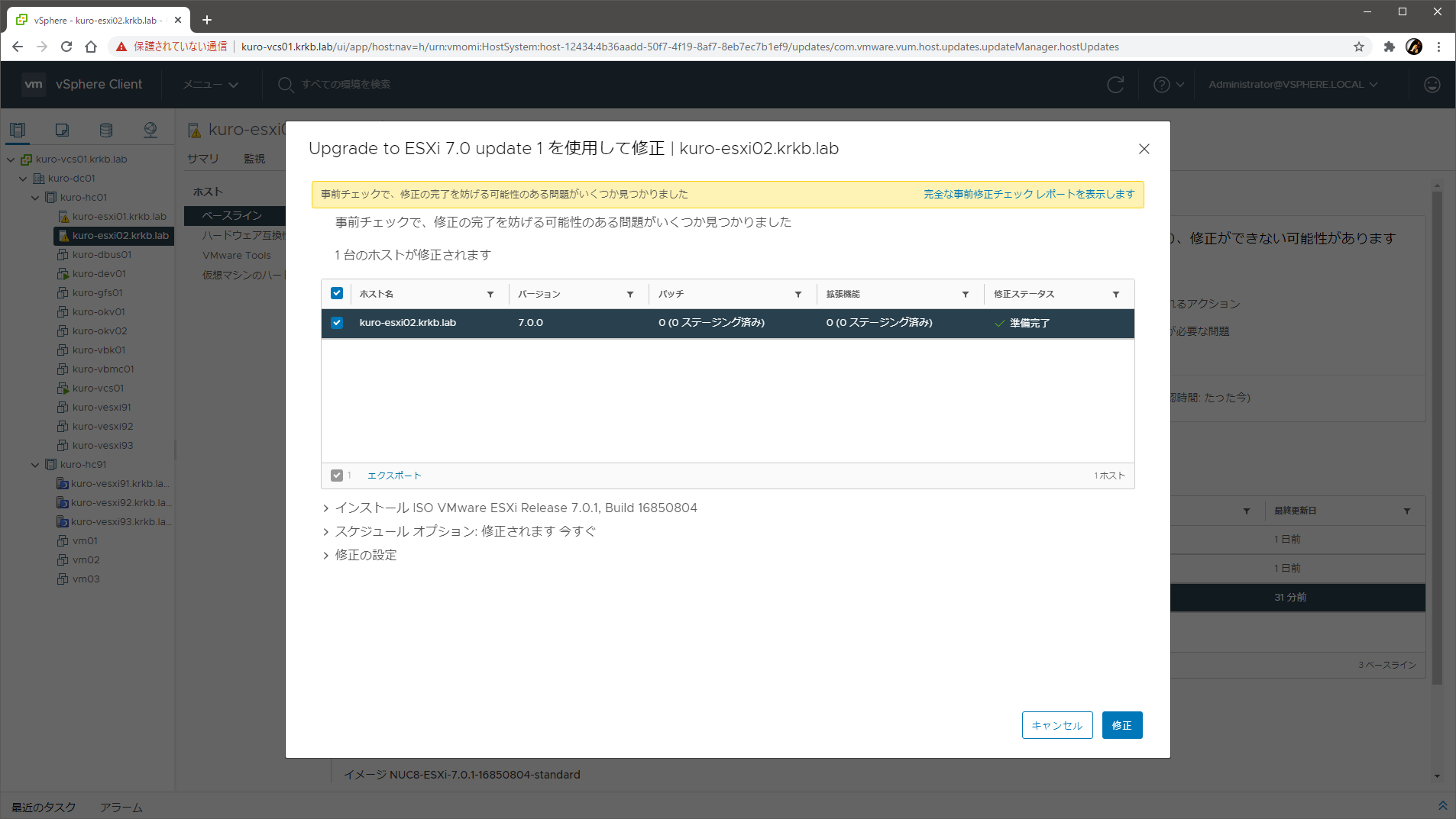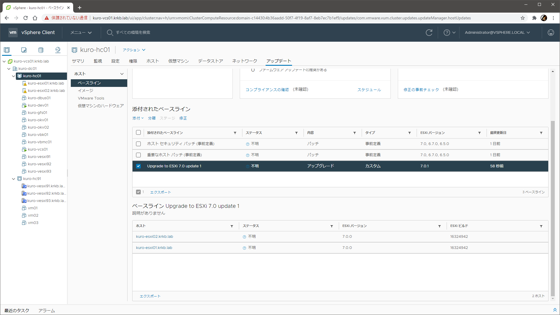 vLCM のイメージ管理は使えなくなりましたが、7.0 U1 化を無事に完了できました。HCL に載っていない非サポートハードウェアだとこういうことがたまにあるので、仕方なしですね。
