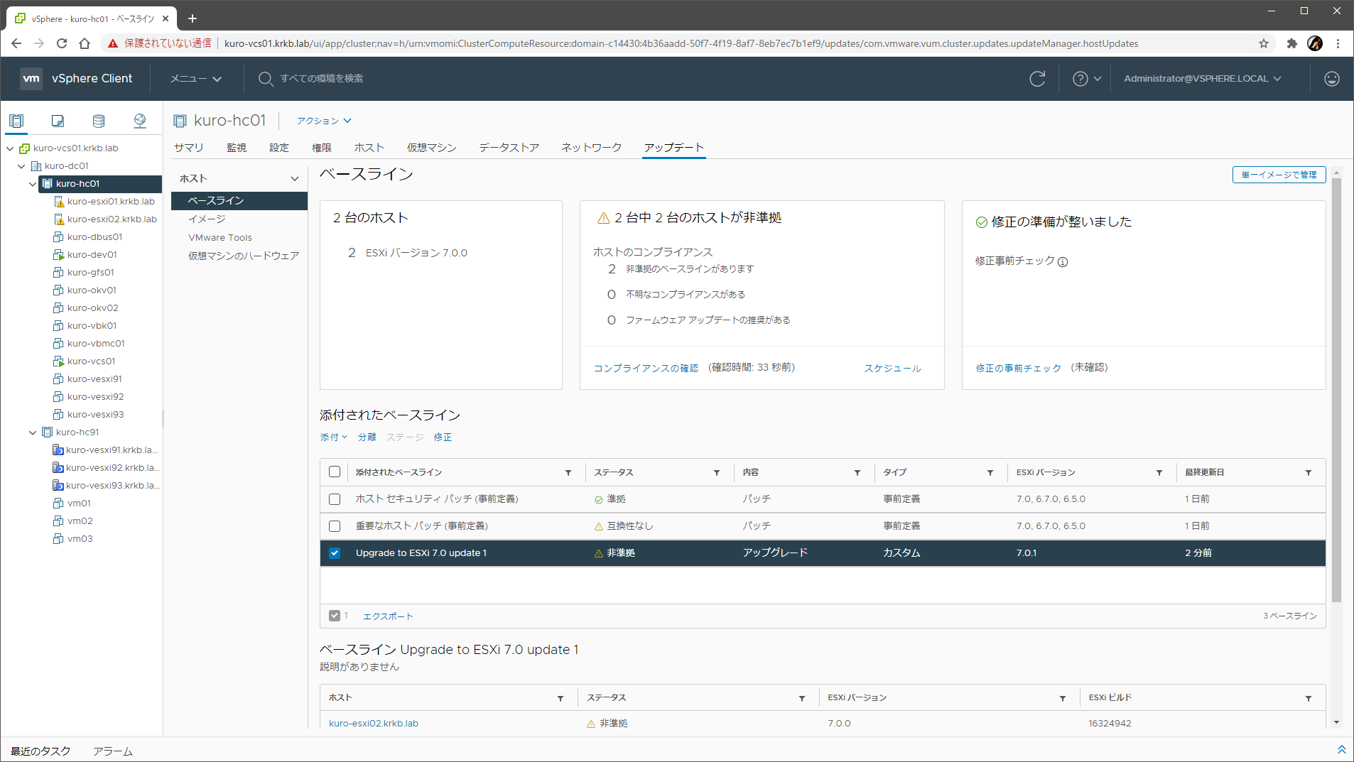 なお、この方法で適用したあとに再度コンプライアンスを確認すると、重要なホストパッチ のベースラインが添付されている場合は、非準拠扱い になりますが、無視する必要があります。これは、あえてアップグレードしていない ne1000 のパッケージが 7.0 U1 相当に上がっていないことによるものです。これを 修正してしまうと再び NIC が認識されなくなる ので、放置するしか手がありません。