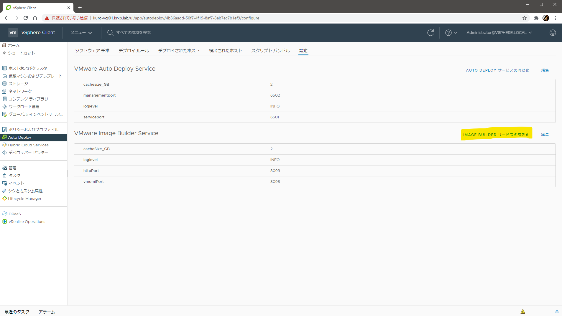 作成には、vCenter Server に組み込みの Auto Deploy の付帯機能である Image Builder を使います。デフォルトではサービスが停止しているので、まずは Auto Deploy の画面の 設定 タブから、IMAGE BUILDER サービスの有効化 を行います。もしくは、VAMI で Image Builder サービス を起動させても同じです。
