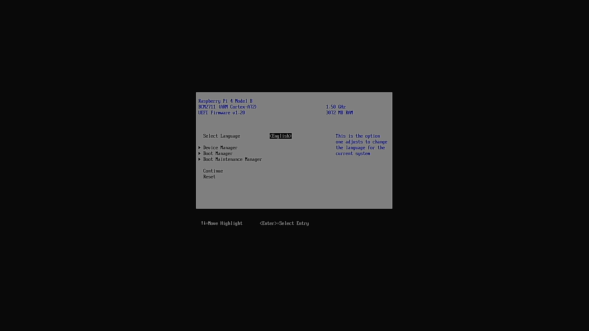 できた SD カードで Raspberry Pi を起動し、Raspberry Pi のロゴが出たら ESC キーで UEFI の設定画面に入ります。