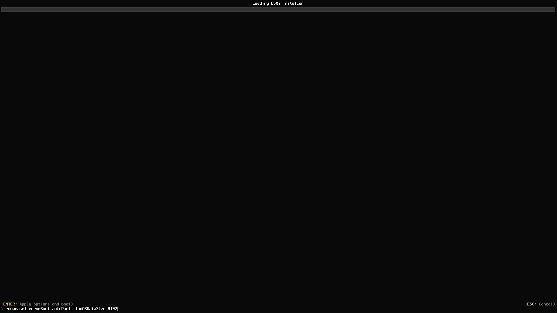今回は、ESXi のインストーラが起動してきたら、Shift + O を押下して、autoPartitionOSDataSize=8192 を起動オプションに追記しました。