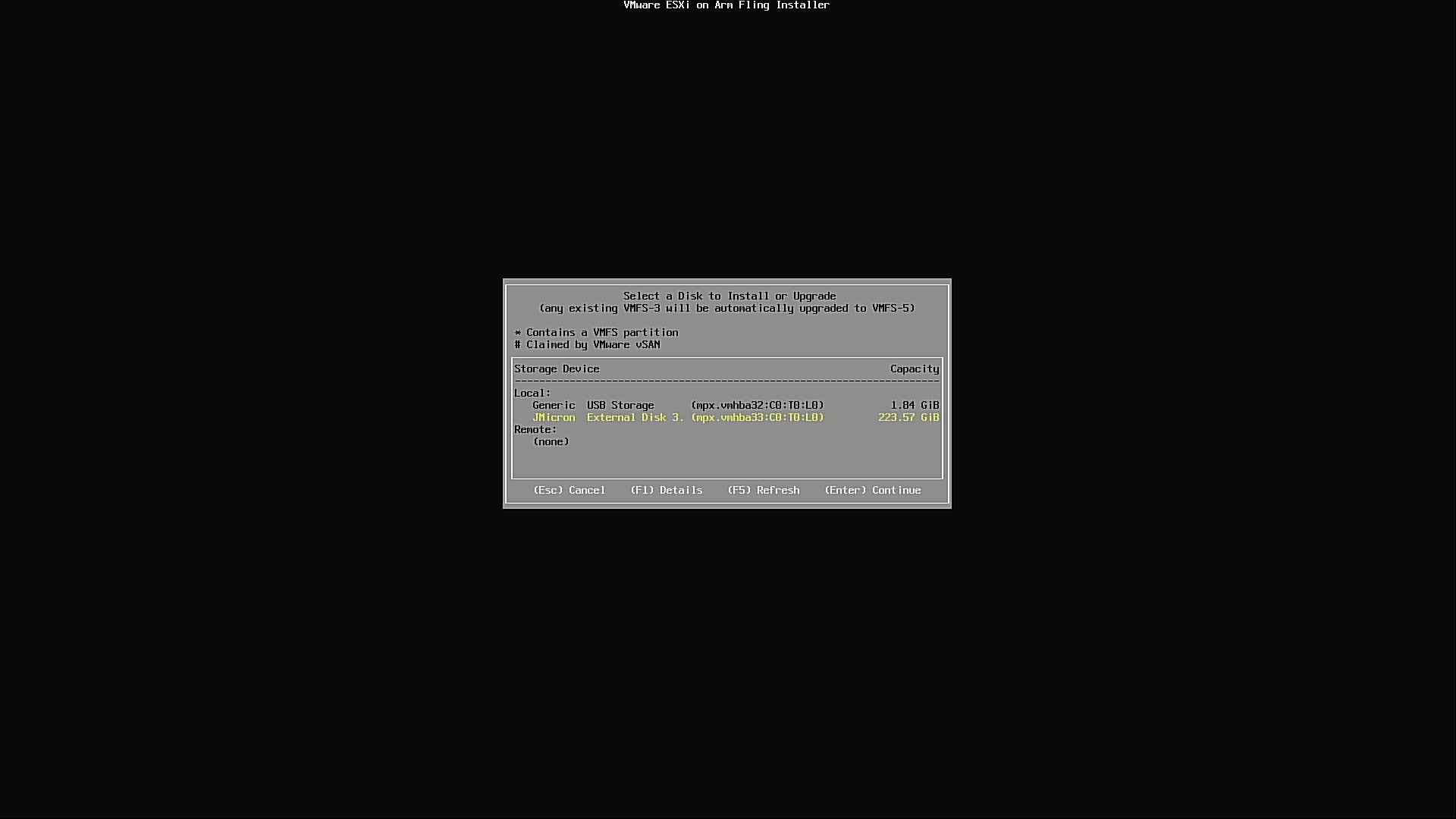 このあとは、普通の ESXi のインストールと同じです。