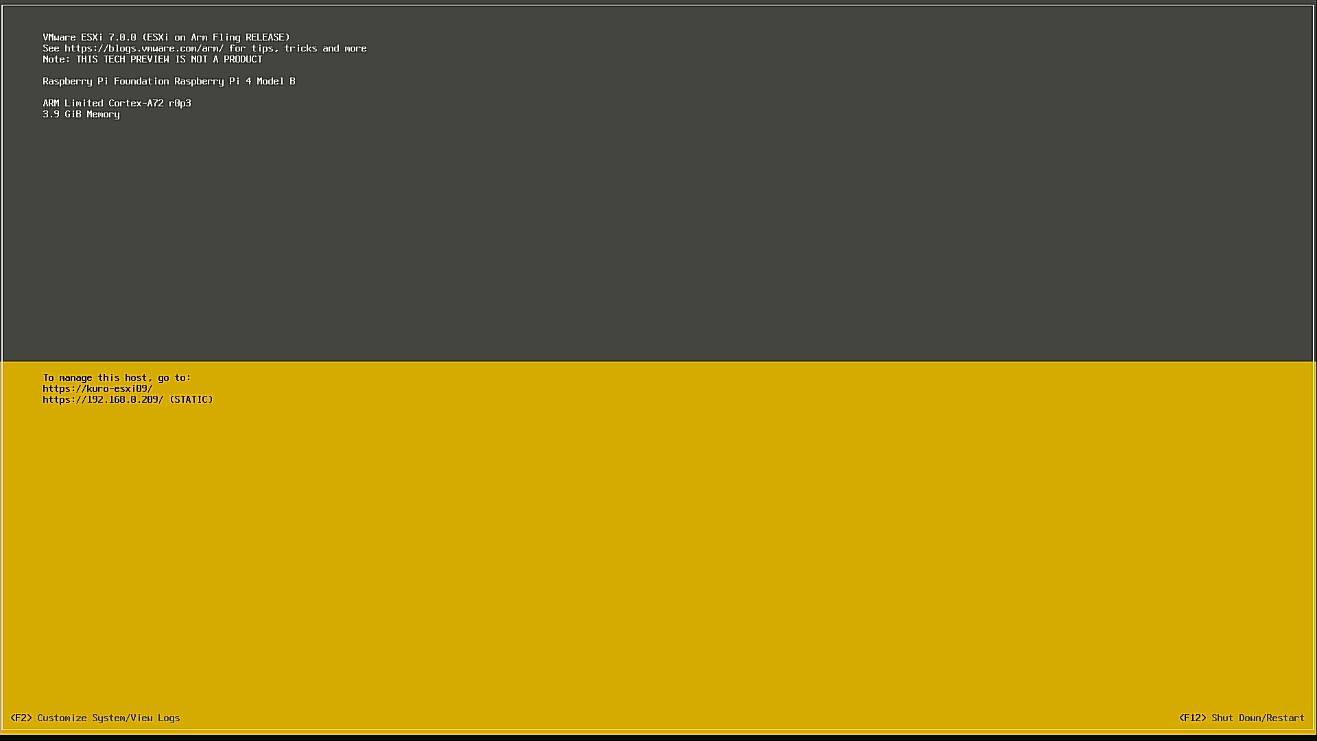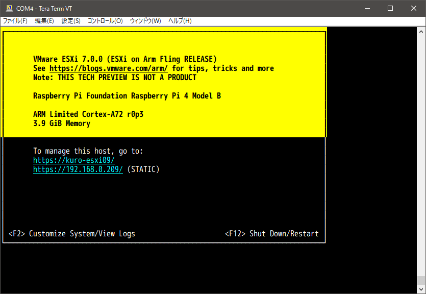 Supported ESXi-Arm Hardware として Raspberry Pi 4 Model B も挙げられていて、家に 4 GB の子が遊んでいた ので、入れてみました。