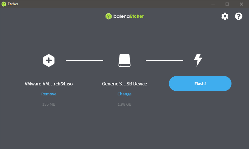 インストーラを用意します。Etcher でも Rufus でもお好みのモノで ESXi Arm Edition の ISO ファイルを USB メモリに書き込むだけです。