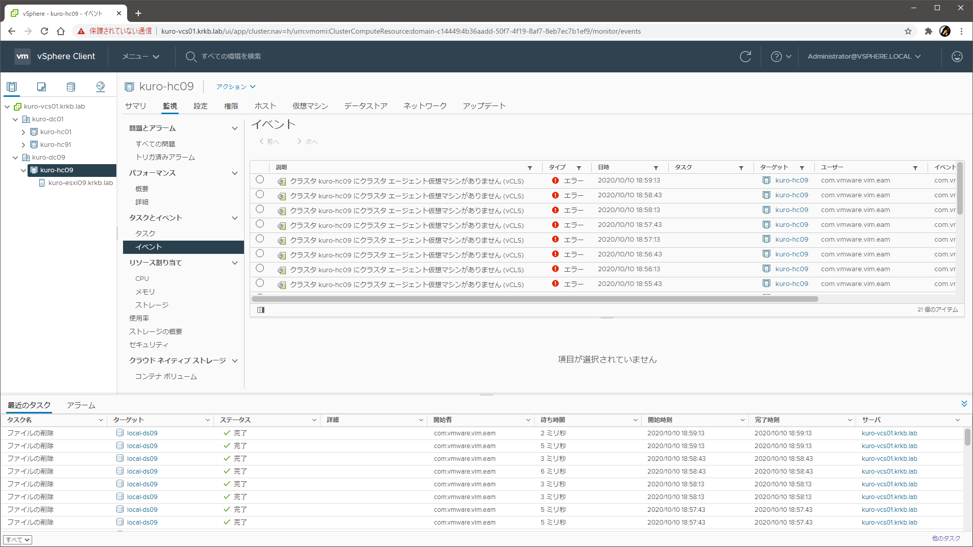 実際、ホストクラスタに ARM な ESXi を追加すると、vCLS が存在しないエラーが上がり続け、内部的にデプロイし続けるからか、ファイルの削除タスクが繰り返される 状態になります。