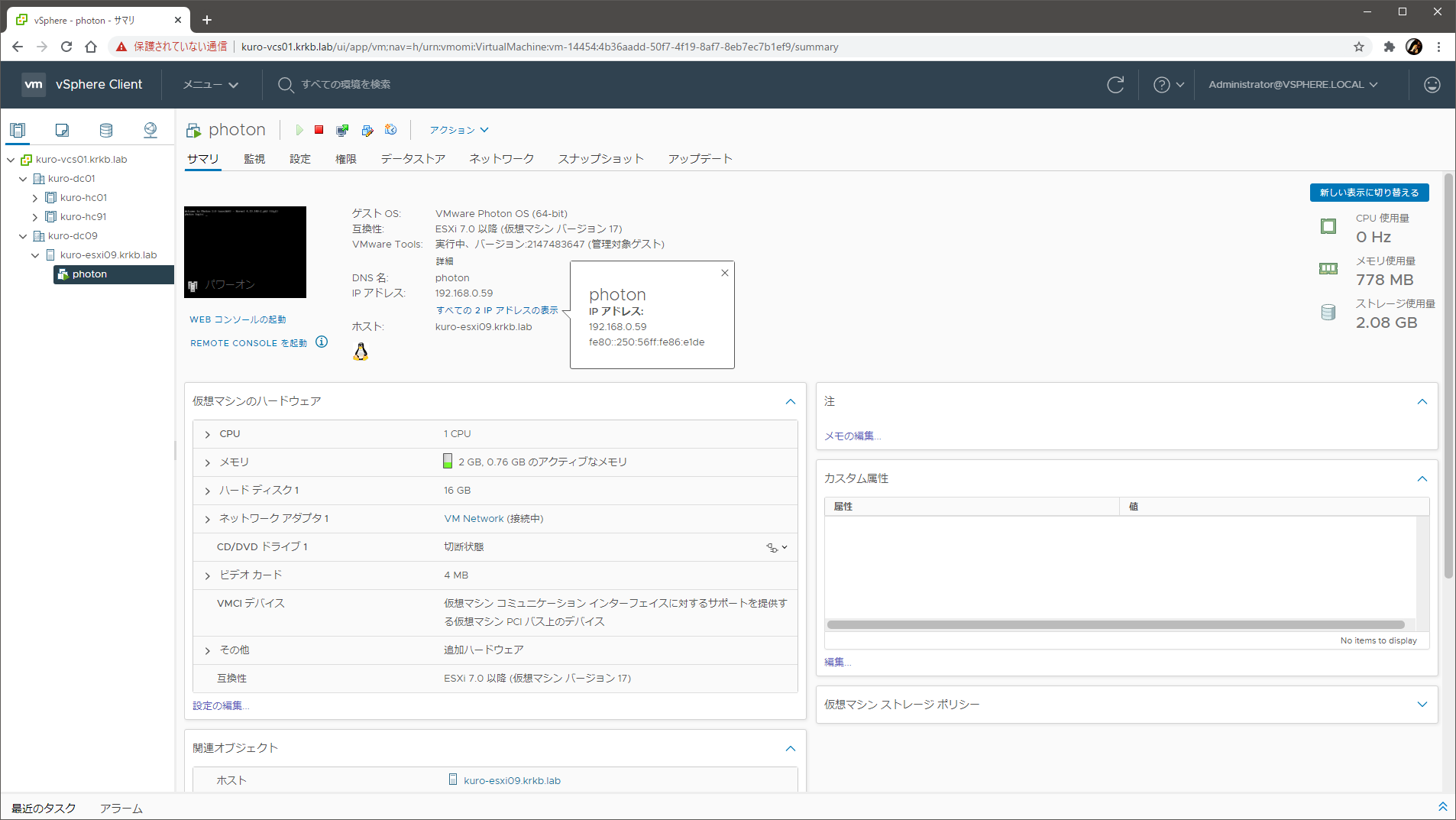 vCenter Server にも登録できました。時刻がズレすぎていると証明書のいろいろで失敗することがある(Unable to push signed certificate to host なエラーが出る)ので、そこだけ登録前に Host Client で直したほうがよさそうです。