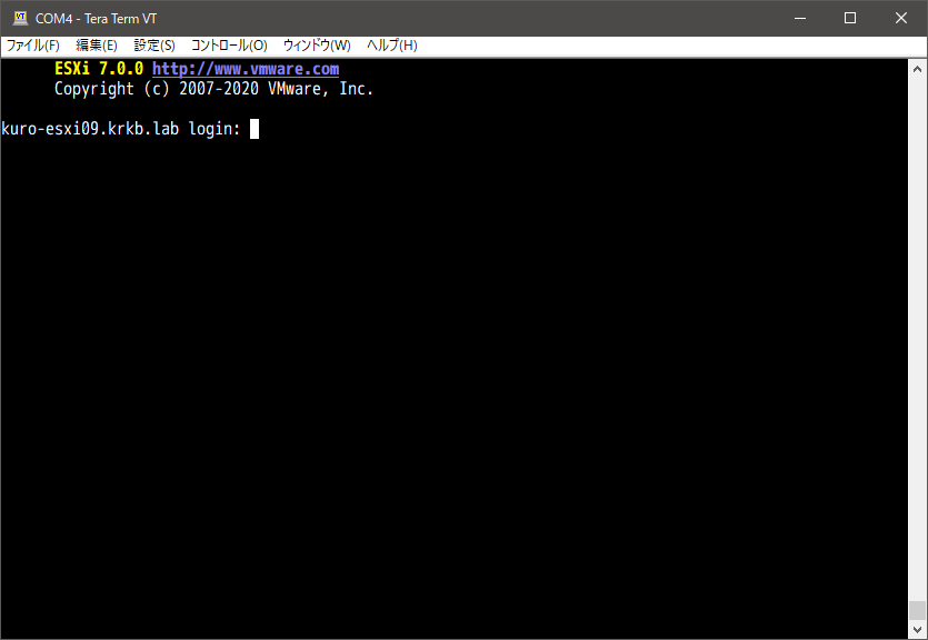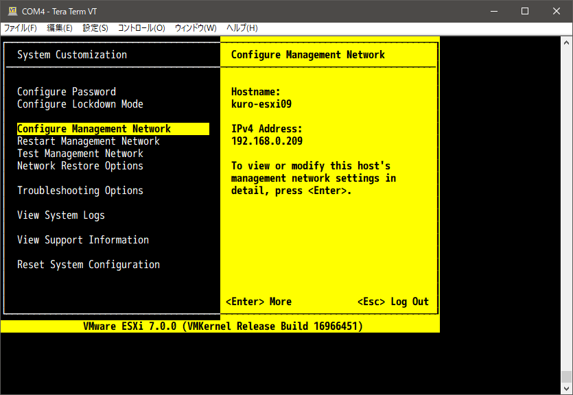 完了後、インストーラの USB メモリを抜いて再起動すれば、素直に ESXi が上がってきます。通常通りネットワークやホスト名などを設定して、完成です。