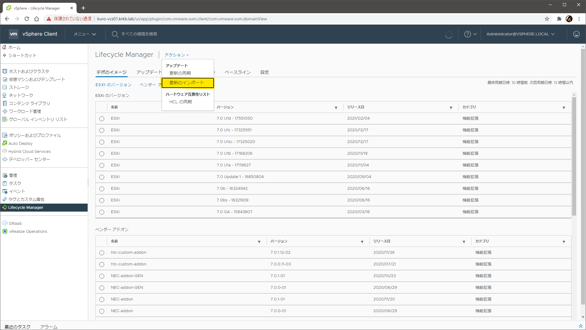 このためには、まずは Lifecycle Manager の画面で、アクション > 更新のインポートACTIONS > Import Updates)でダウンロードした ZIP ファイルをインポートします。