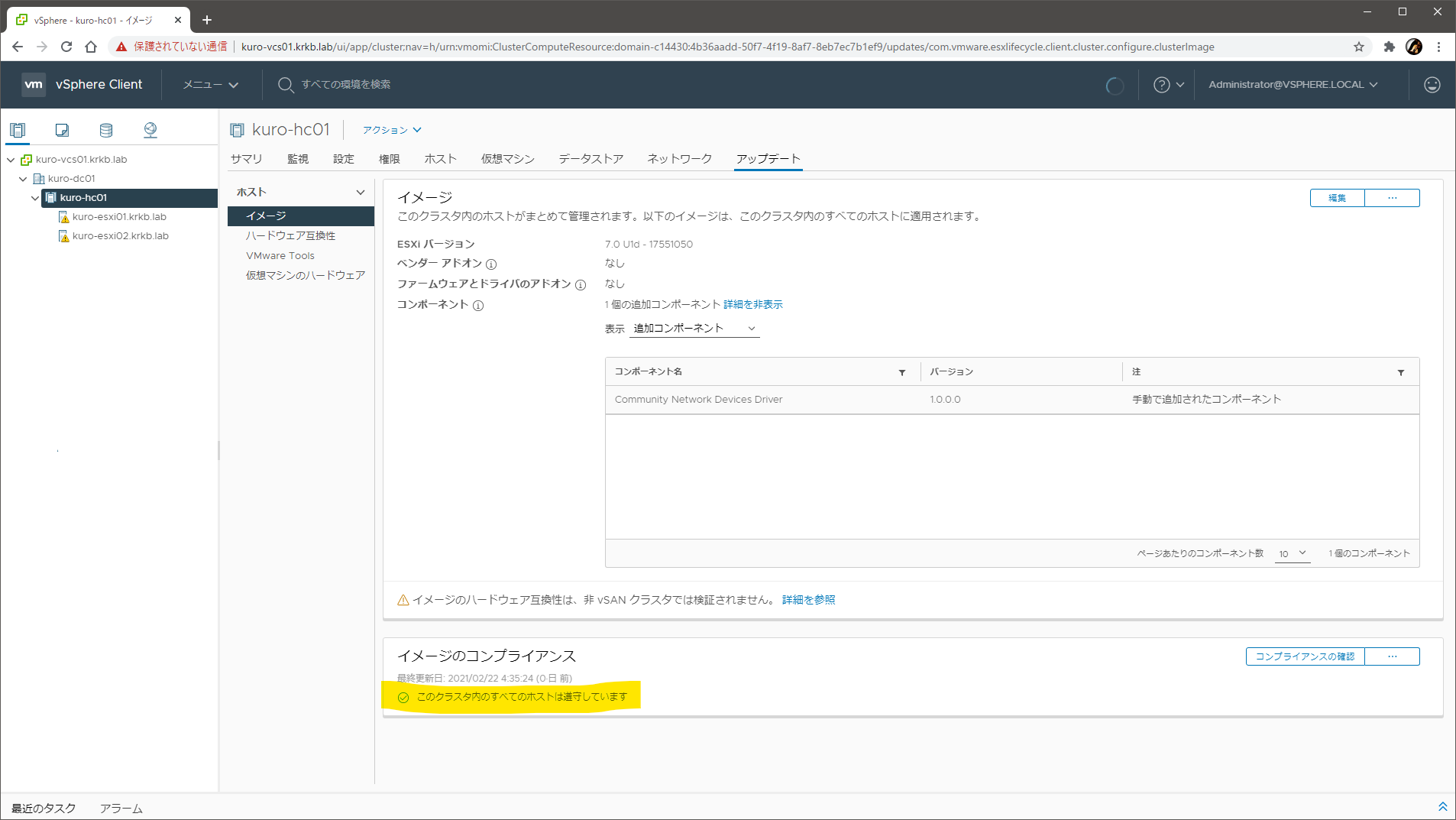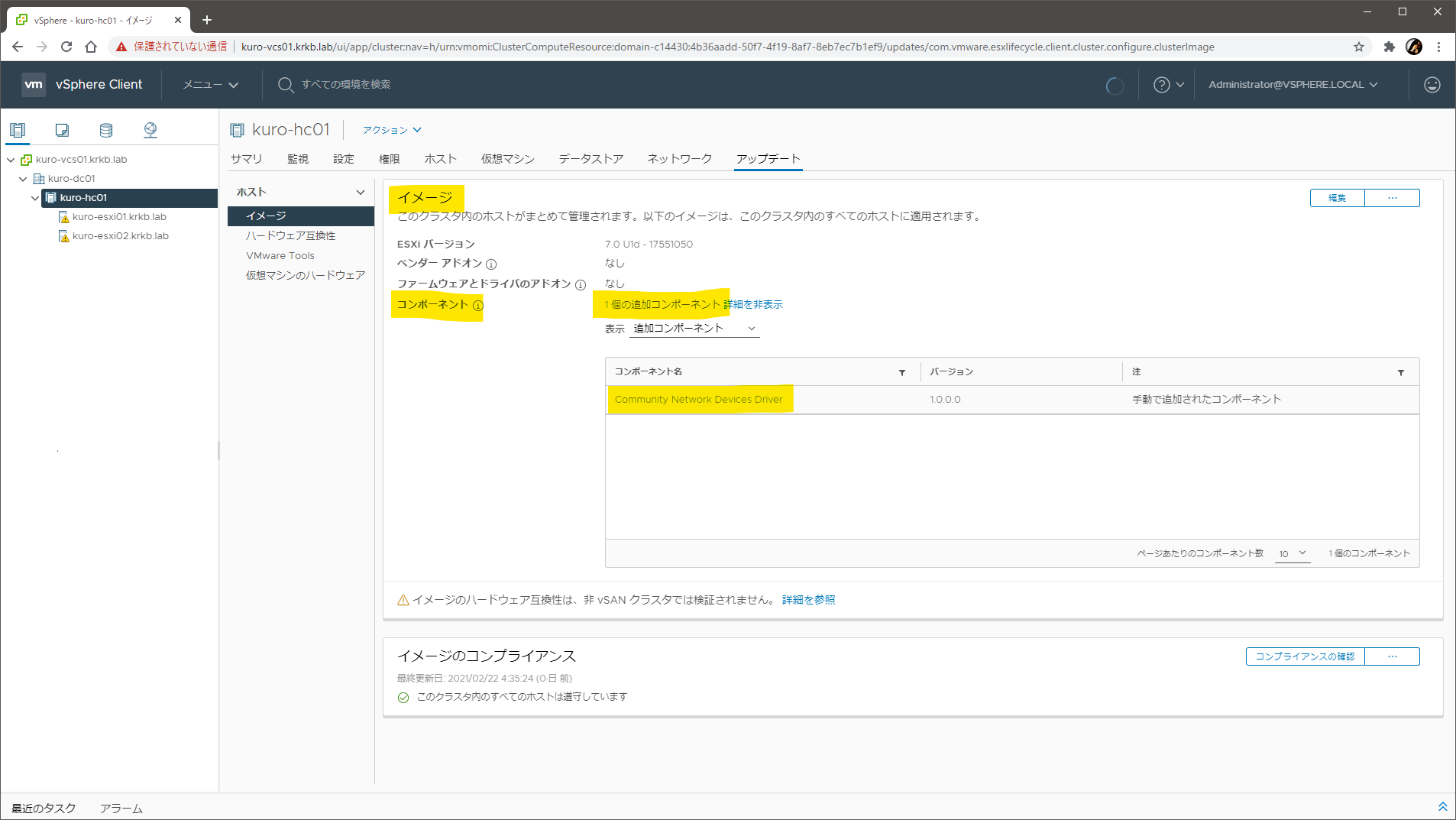 これで、クラスタの ESXi ホストにとって あるべき状態(Desired State や Desired Image と表現されます)として、指定した ESXi のベースイメージに今回のドライバが追加された状態が定義されました。あとはコンプライアンスを確認して、クラスタの ESXi ホストをこのイメージに準拠するよう修正すれば、実際にドライバが導入されます。