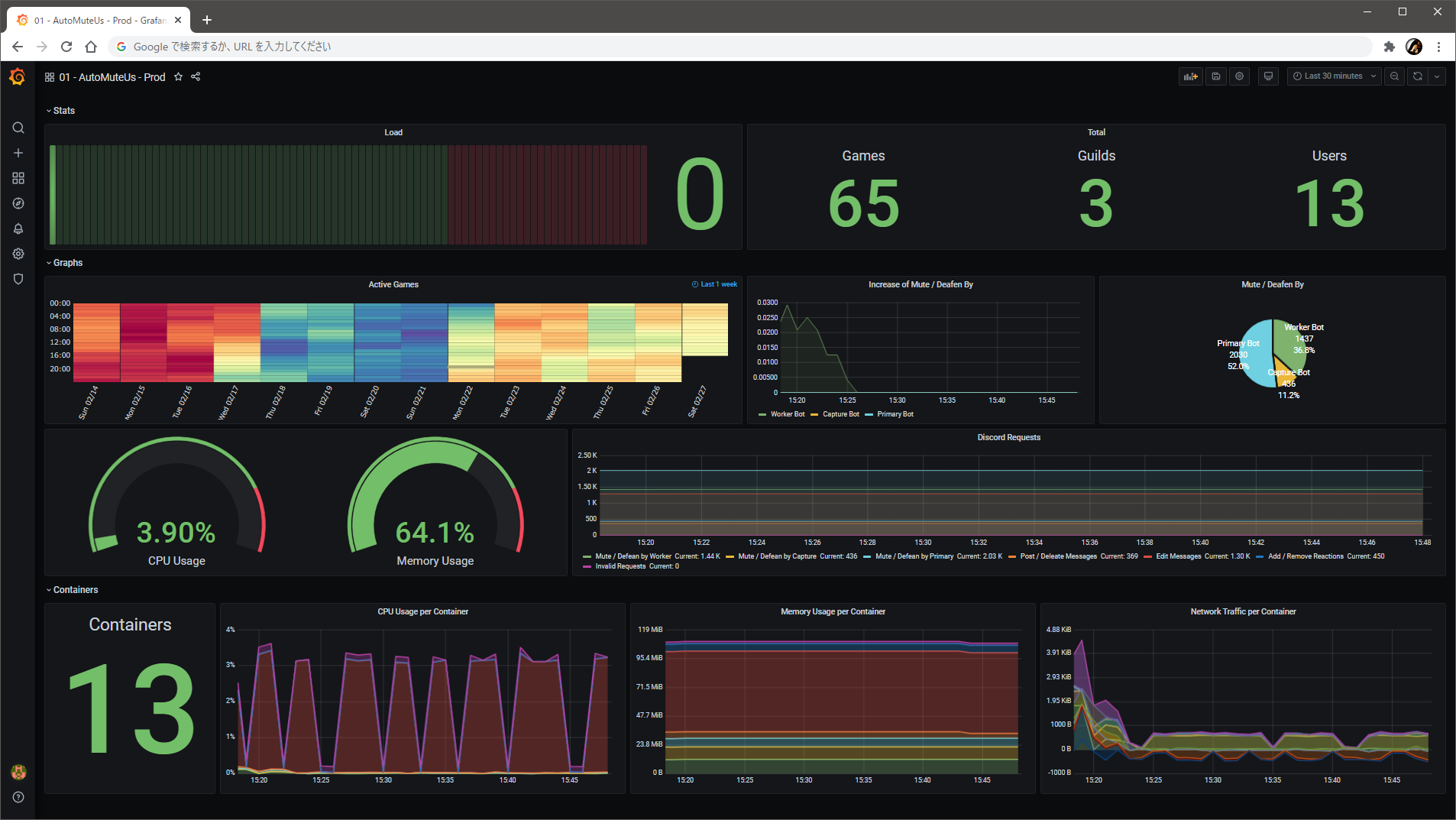 AutoMuteUs は組み込みで Prometheus のコレクタ(!)を持っているので、それと Galactus のエンドポイントが返す JSON などを使うと、こういうモニタリング画面が比較的簡単に作れます。