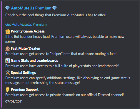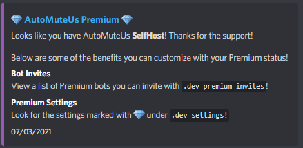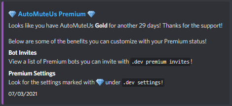 公式ボットを利用しているサーバでは、現在利用しているプランを /premium info(.au premium)コマンドで確認できます。