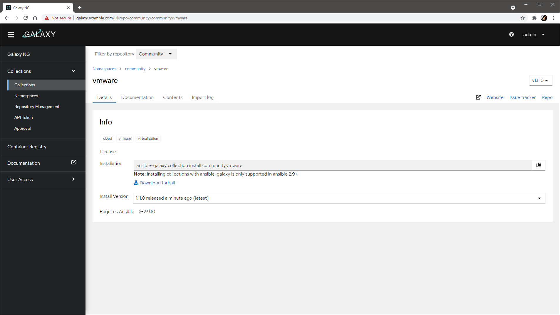 Downloading https://galaxy.example.com/api/galaxy/v3/artifacts/collections/community/community-vmware-1.11.0.tar.gz to /home/kuro/.ansible/tmp/ansible-local-2778028ny7vtjq5/tmpxhmwondd/community-vmware-1.11.0-__wjvlah