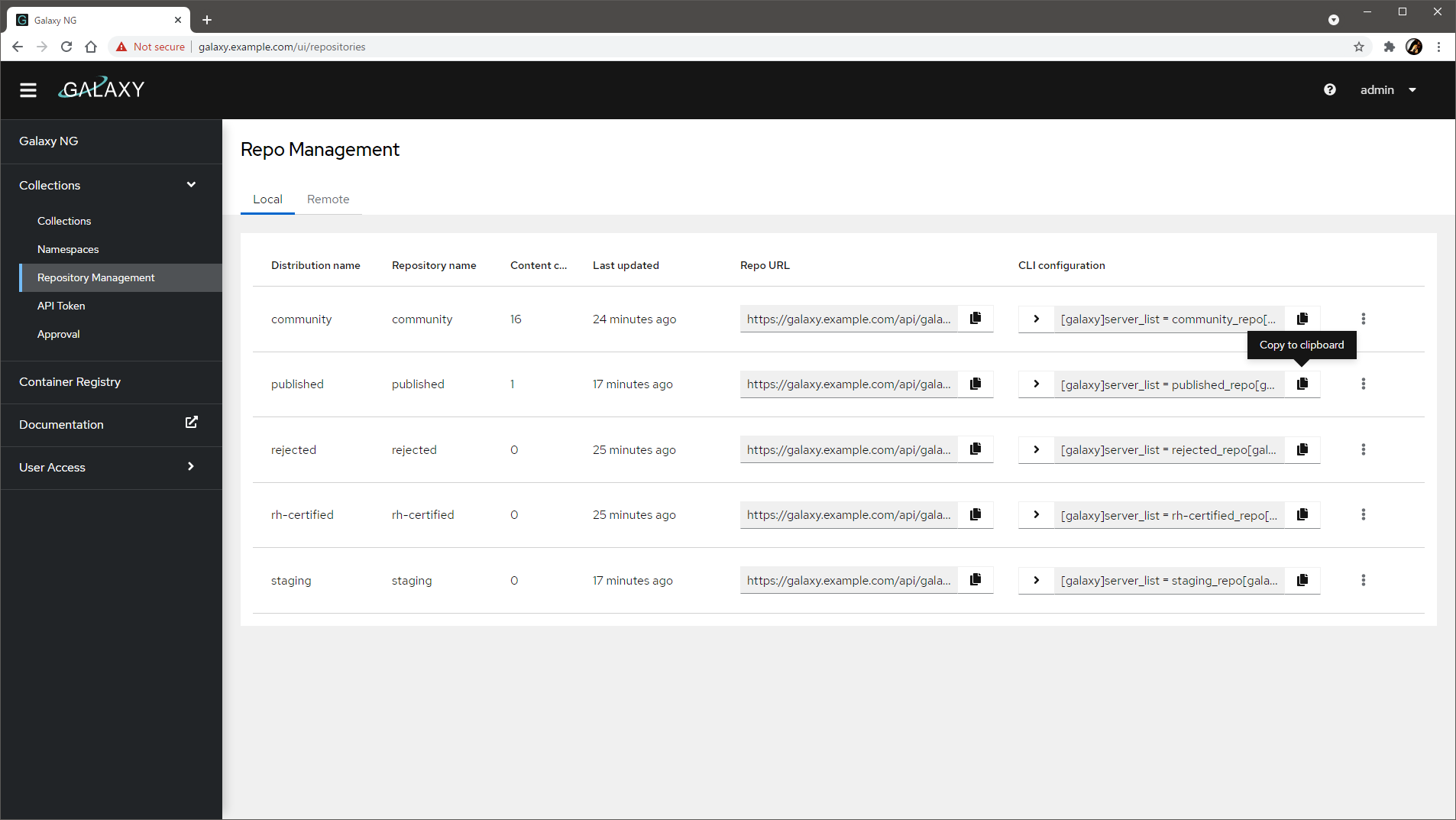 リポジトリの URL は Galaxy NG の Repository Management の画面から、トークンは API Token からそれぞれ取得できます。