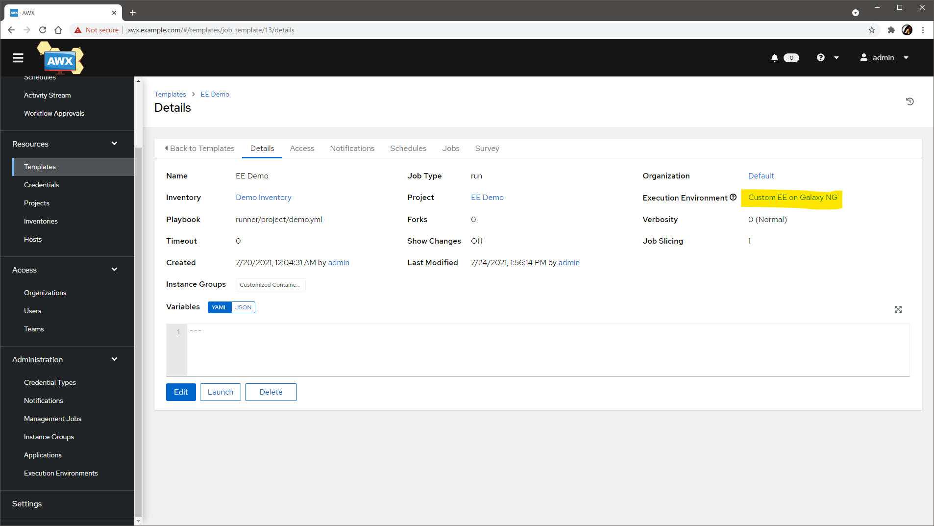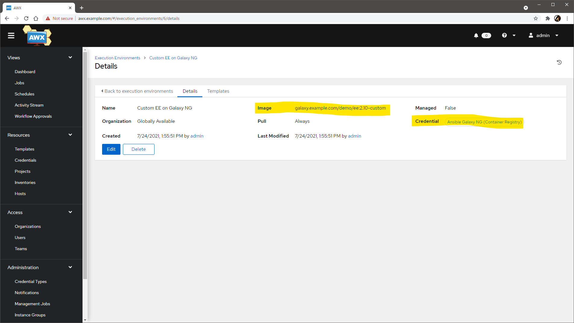 AWX 側からは、コンテナレジストリとしての Galaxy NG はもはや何の特別なものではないので、Galaxy NG に配置した Execution Environment を AWX から使うときに必要な操作も、ほかのコンテナレジストリの場合と何ら変わりはありません。