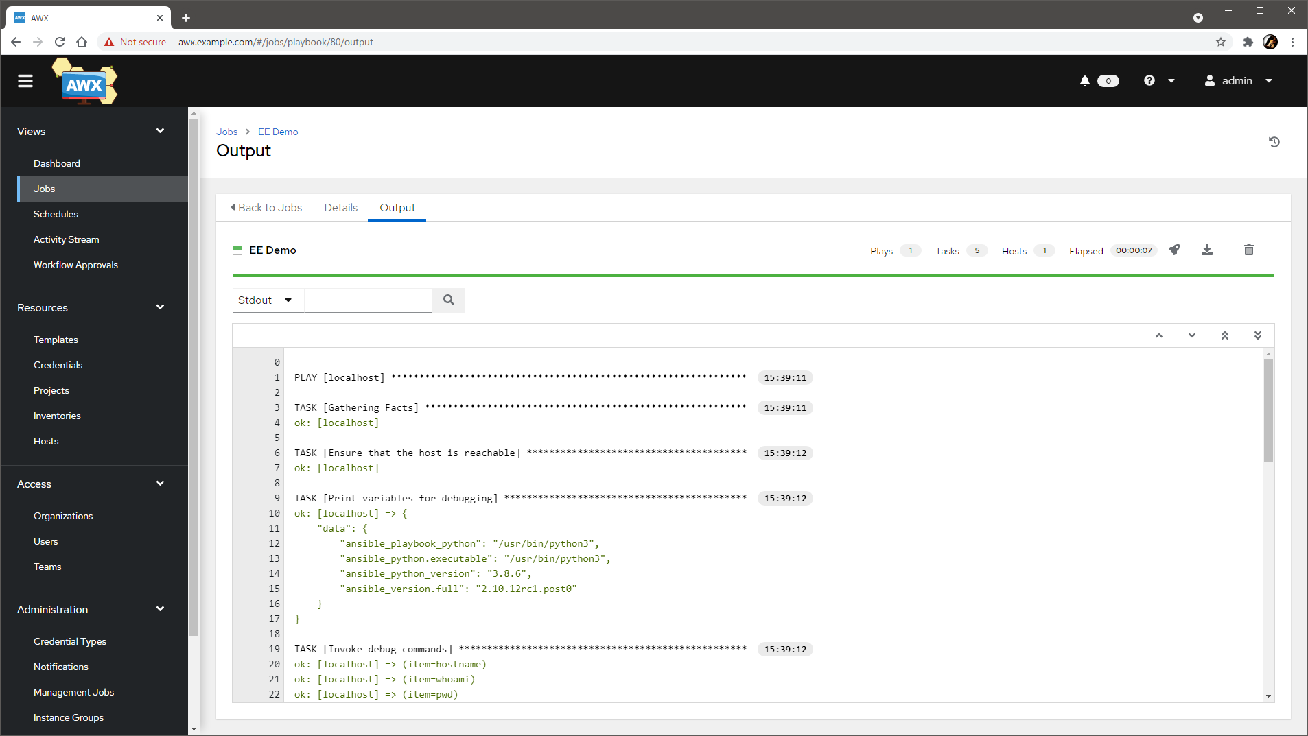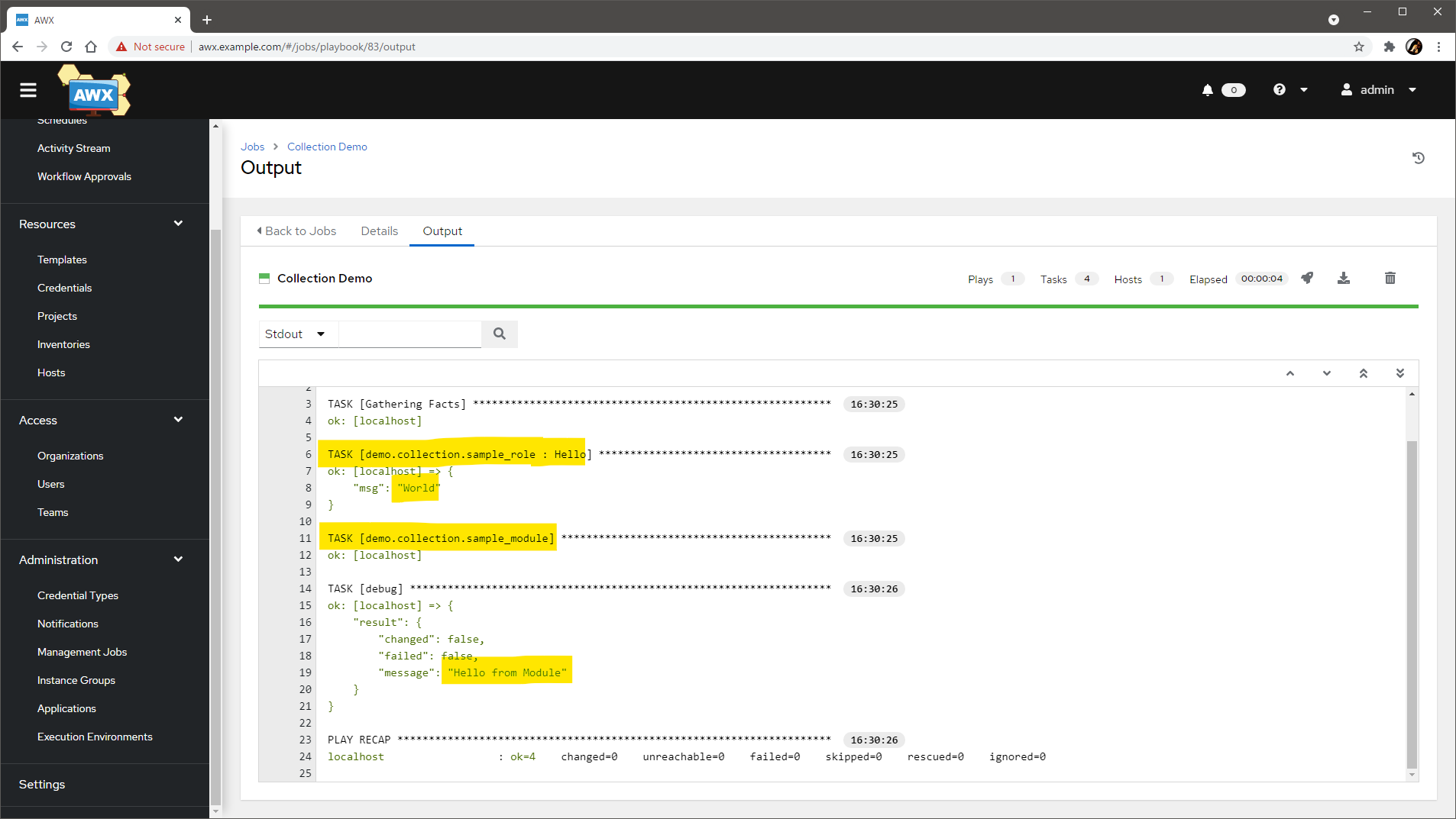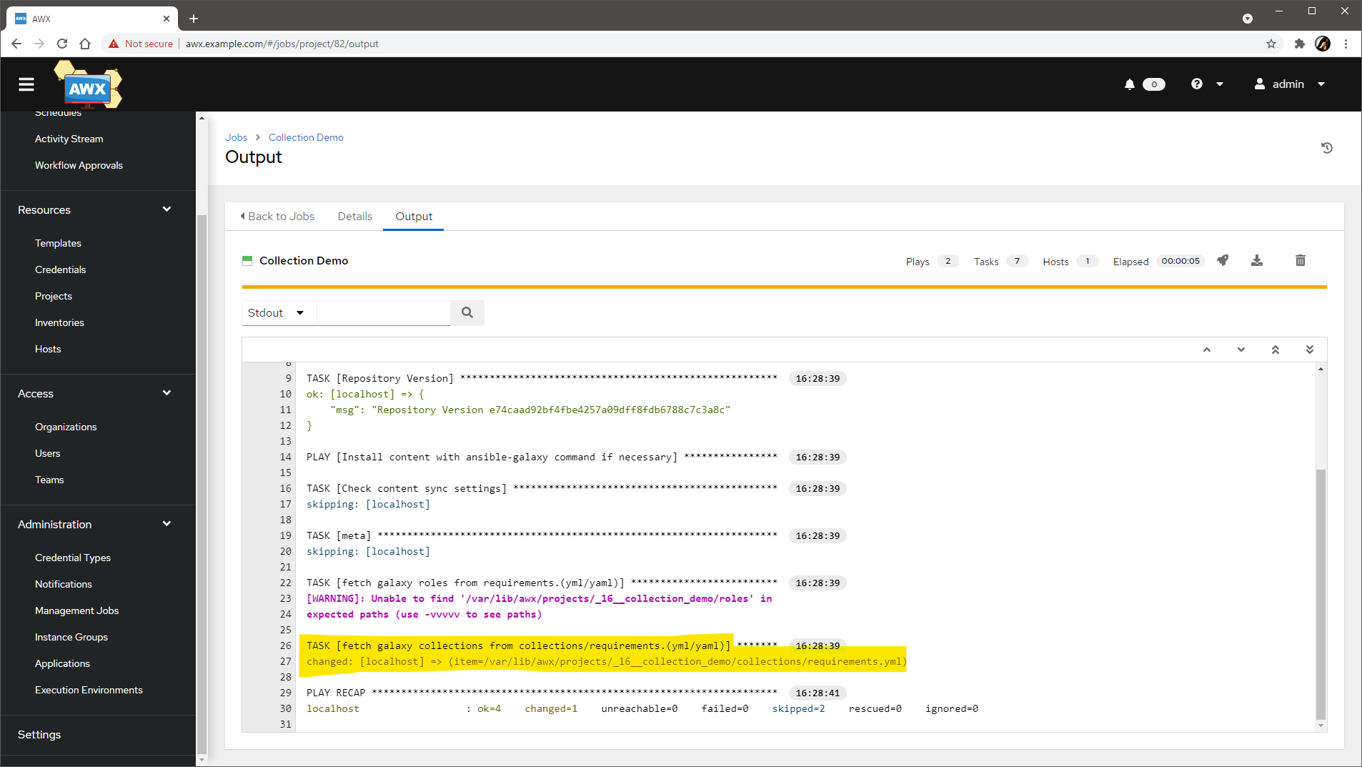これを AWX 側にプロジェクトとして登録して Sync すると、正しく設定できていれば、登録した認証情報を使って、プライベート Galaxy NG からコレクション demo.collection がインストールされます。