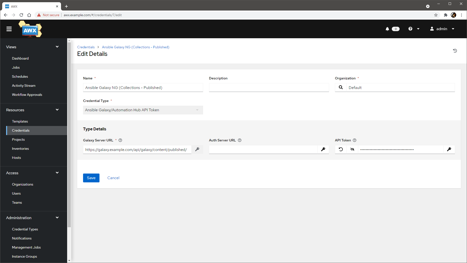 まずは Galaxy NG の認証情報の登録です。前述した ansible.cfg の中身に相当する情報を、タイプ Ansible Galaxy/Automation Hub API Token の Credential として登録します。この時に、最終的にプロジェクトが紐づく Organization を明示 します。ここでは Default です。