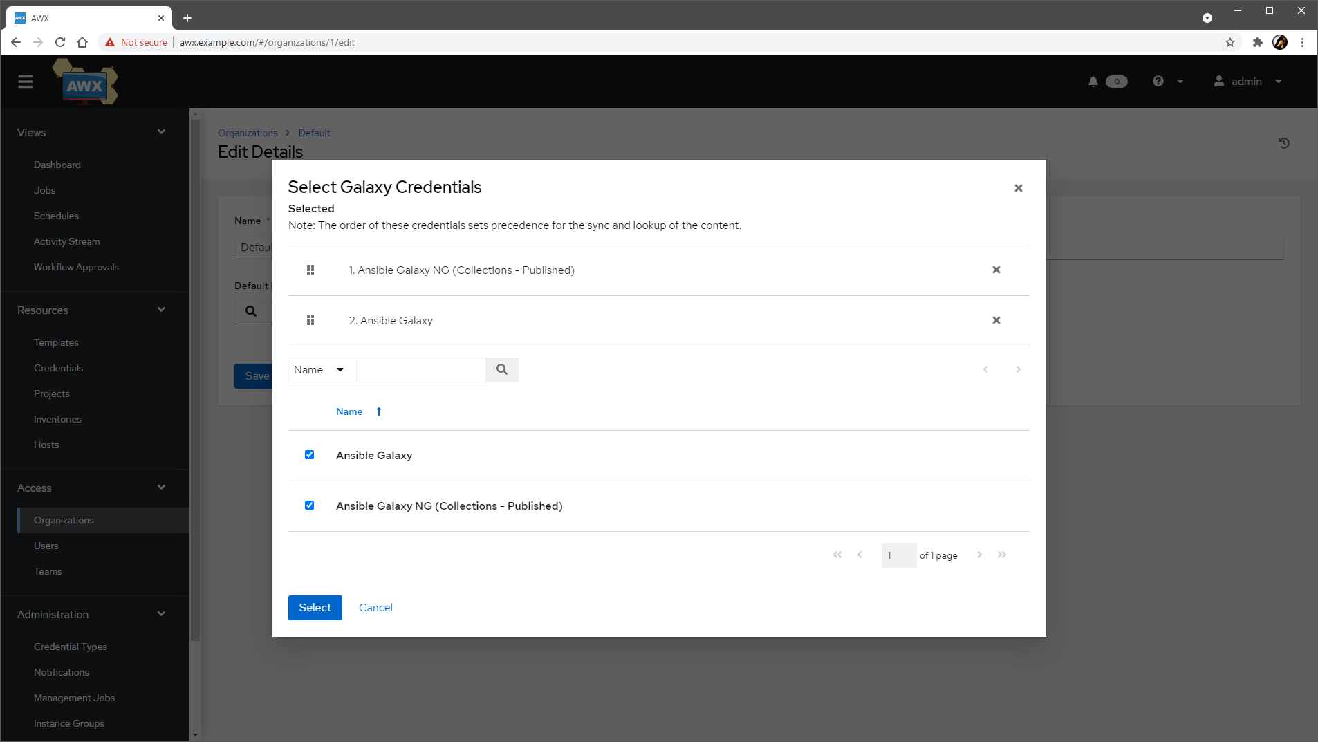 公開 Galaxy サーバであれば特に設定なく使えますが、今回の Galaxy NG はプライベートサーバなので、若干の構成が必要です。プロジェクトが利用する Galaxy サーバ は AWX 上の Organization 単位で指定する ため、設定はOrganization を意識しながら行います。