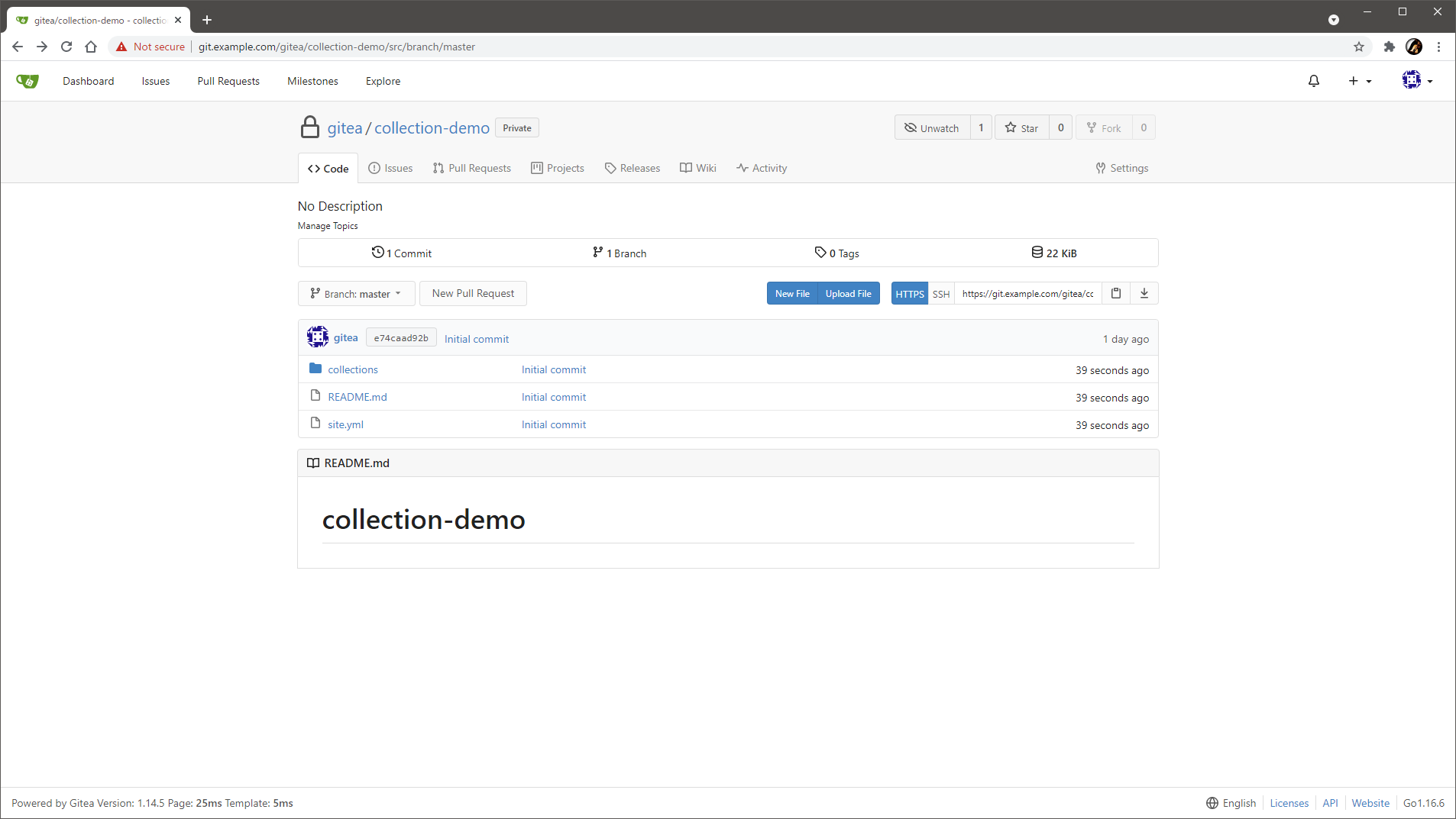 これで、AWX から Galaxy NG を利用できる状態が整いました。実験のため、次のコマンドで最小限のファイルを作成し、collection-demo ディレクトリの中身を Git リポジトリにプッシュします。