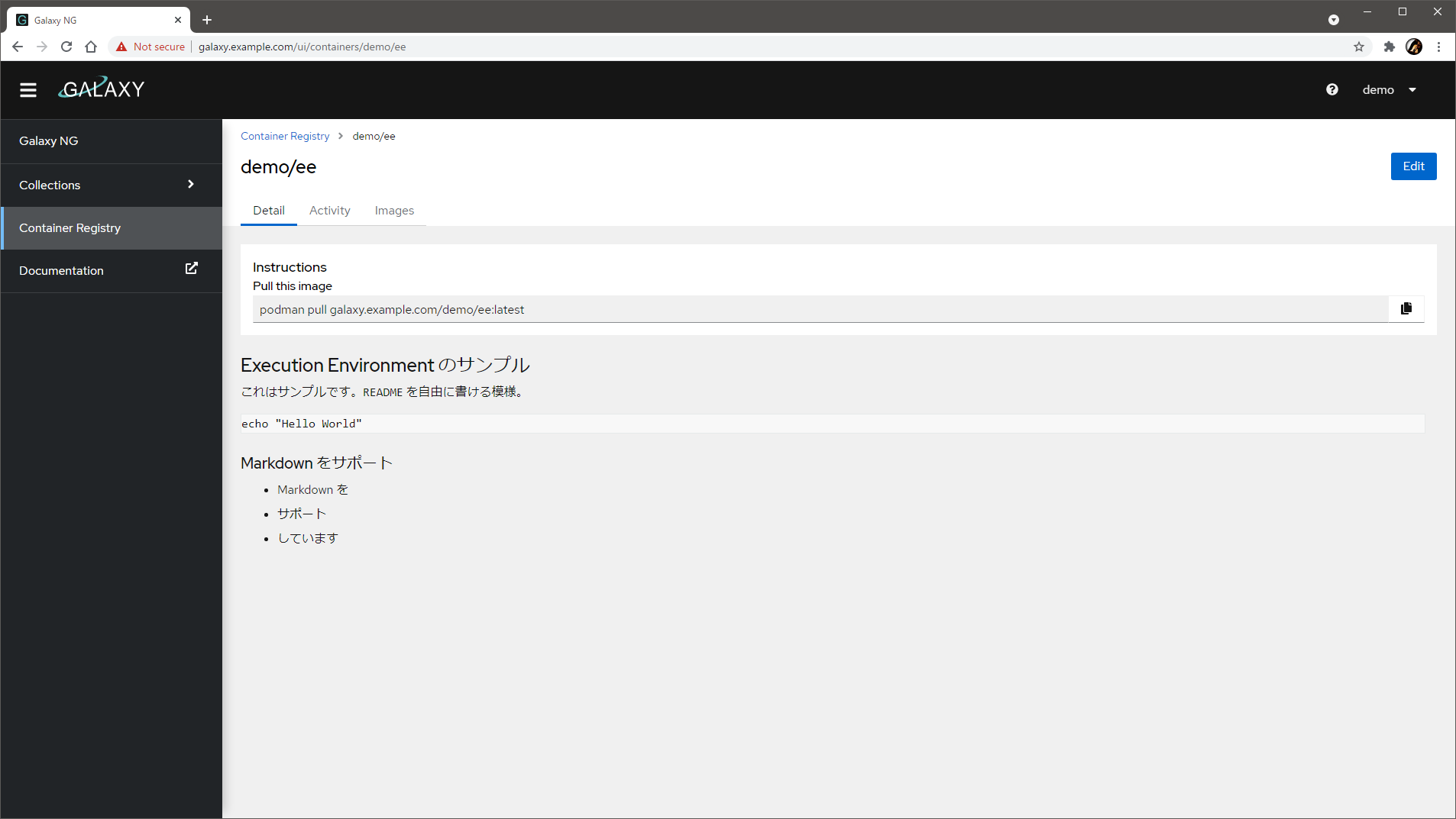 Galaxy NG は、紹介した手順でデプロイすると、コンテナレジストリとしても使えます。Execution Environment の置き場所として便利そうですね。