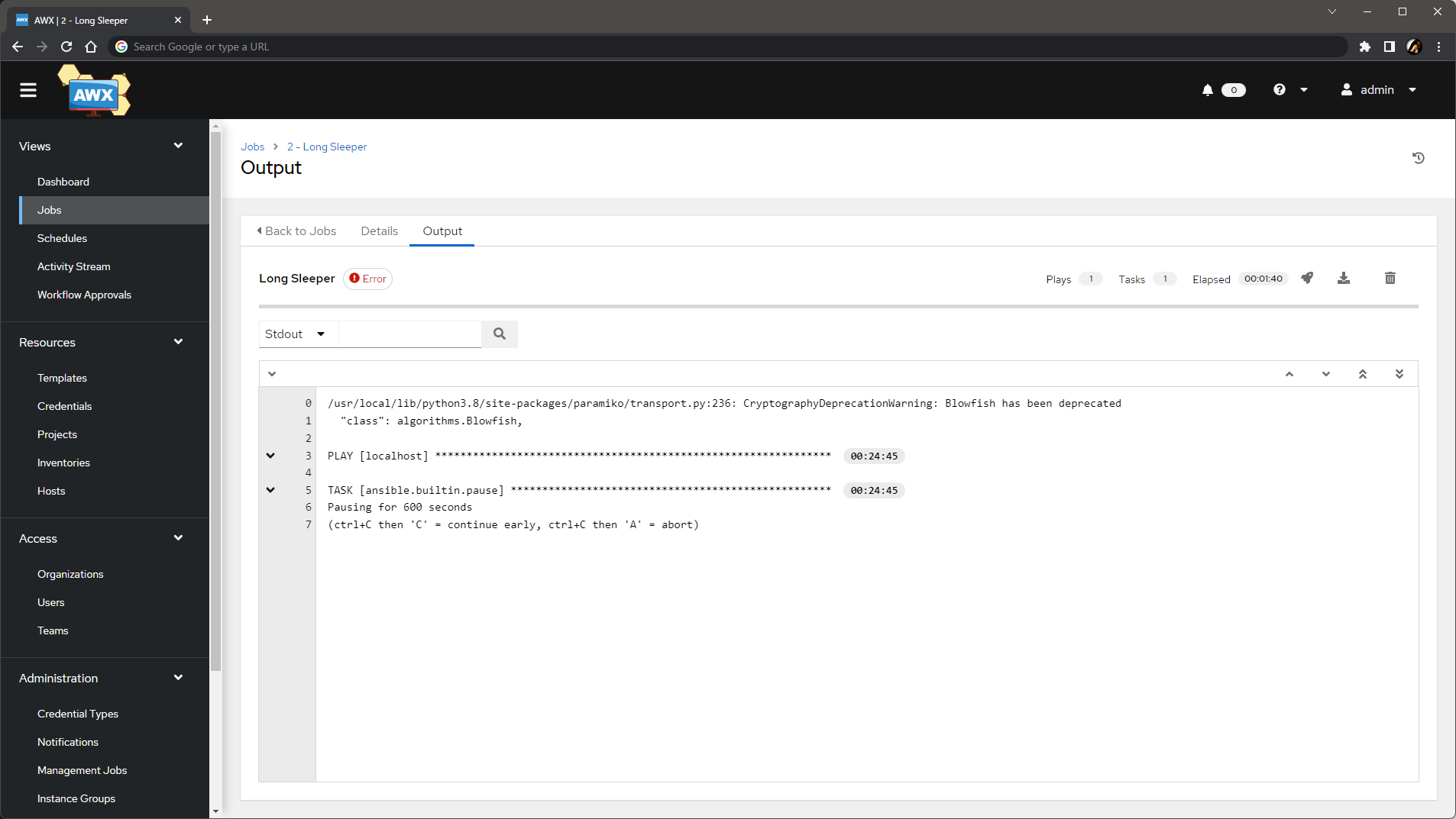 $ kubectl -n awx logs -f automation-job-5-vr8v7